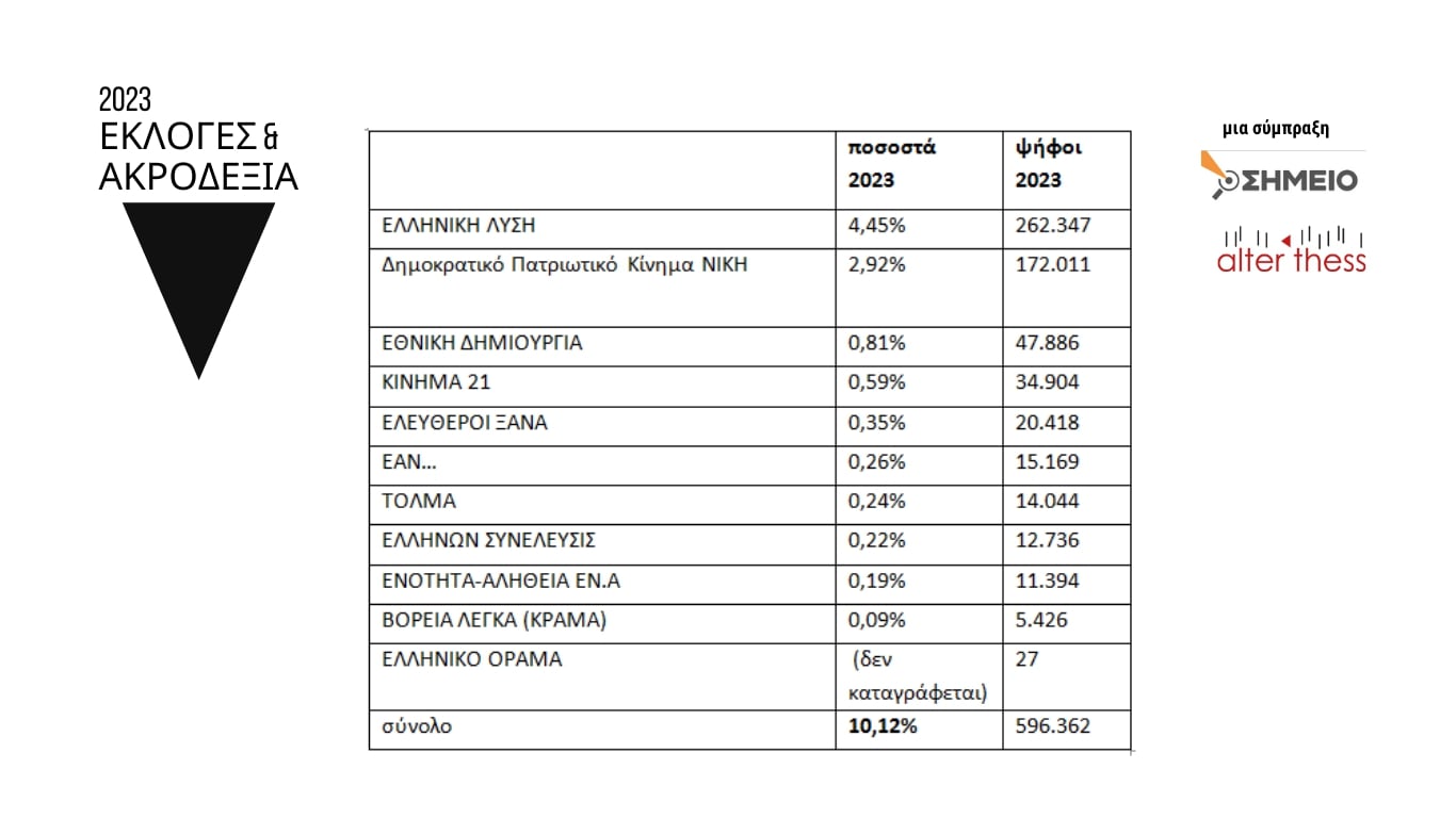 Είχαμε καταγράψει 11 κόμματα από τον χώρο της Ακροδεξιάς που έλαβαν μέρος στις εκλογές της 21ης Μαΐου. Παρουσιάζουμε τώρα τα αποτελέσματα που καταδεικνύουν την εκλογική δύναμη της Ακροδεξιάς.