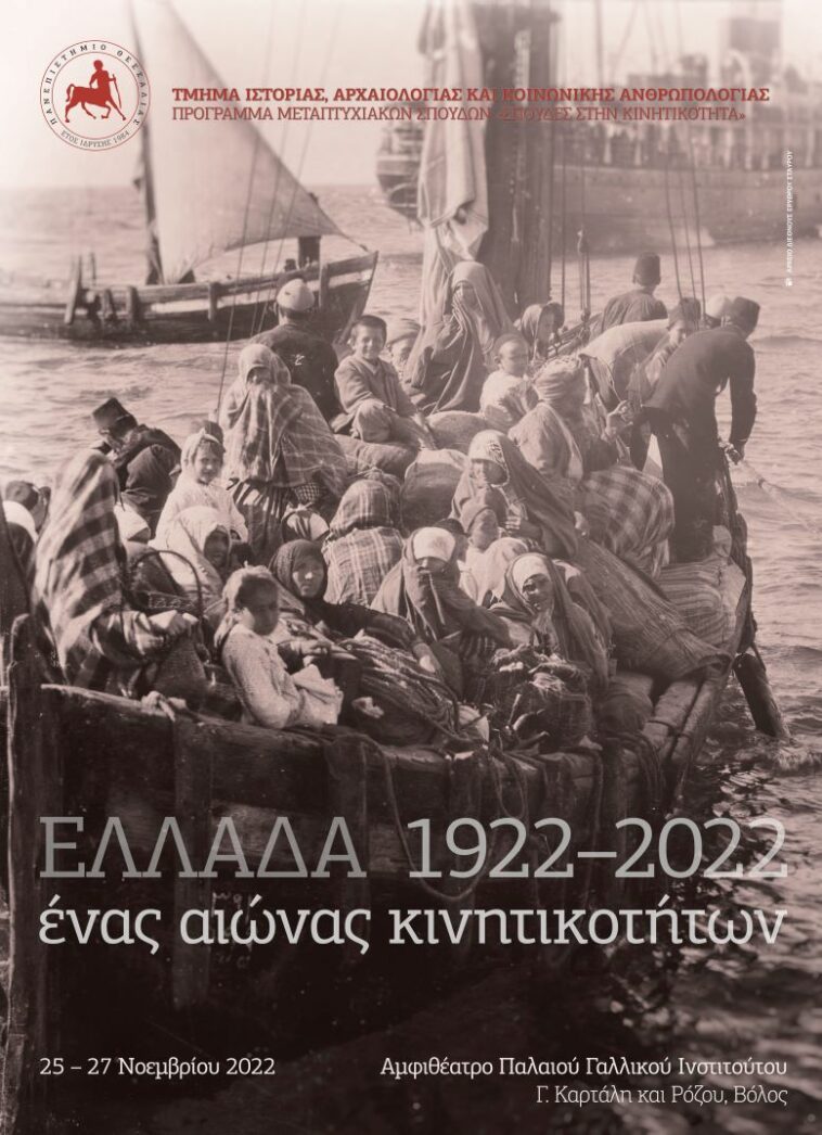 Συνέδριο με θέμα “Ελλάδα 1922-2022: Ένας αιώνας κινητικοτήτων” διοργανώνεται από τις 25 έως τις 27 Νοεμβρίου 2022 στο αμφιθέατρο Οικονομικού Τμήματος από το Τμήμα Ιστορίας, Αρχαιολογίας και Κοινωνικής Ανθρωπολογίας του Πανεπιστημίου Θεσσαλίας.