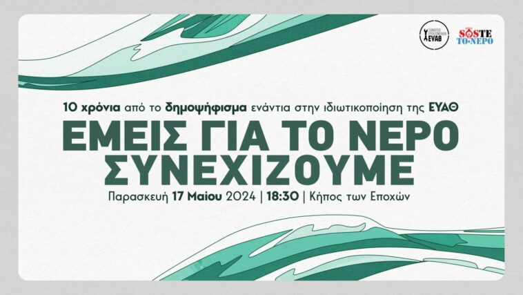 Συμπληρώνονται φέτος 10 χρόνια από το δημοψήφισμα ενάντια στην ιδιωτικοποίηση της ΕΥΑΘ. 10 χρόνια μαζικών, κοινωνικών και δημιουργικών δράσεων για το Δικαίωμα στο Νερό. Όπως ανακοινώθηκε στα μέσα κοινωνικής δικτύωσης, το Σωματείο Εργαζομένων της ΕΥΑΘ και το SOSτε το Νερό οργανώνουν ανοικτή εκδήλωση την Παρασκευή 17 Μαίου 2024, στις 18.30 στον Κήπο των Εποχών της Νέας Παραλίας Θεσσαλονίκης.