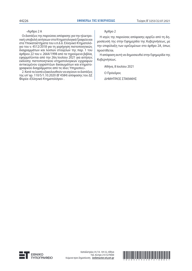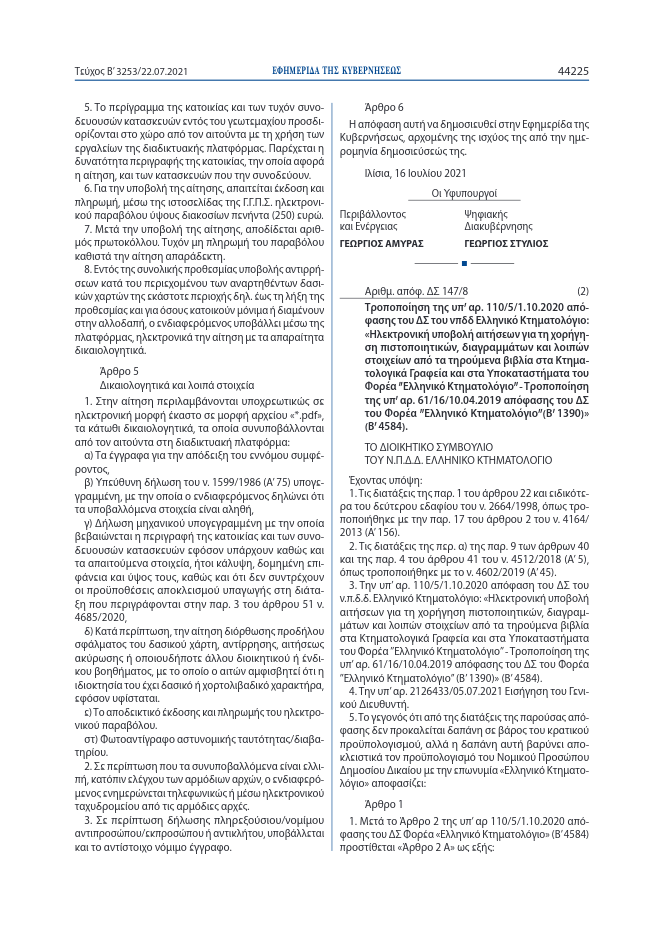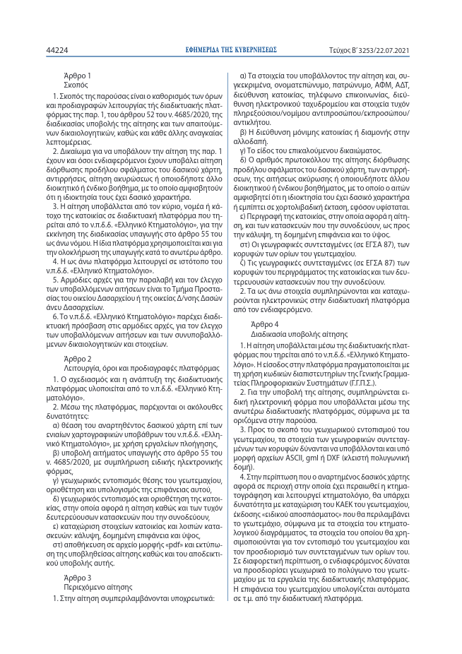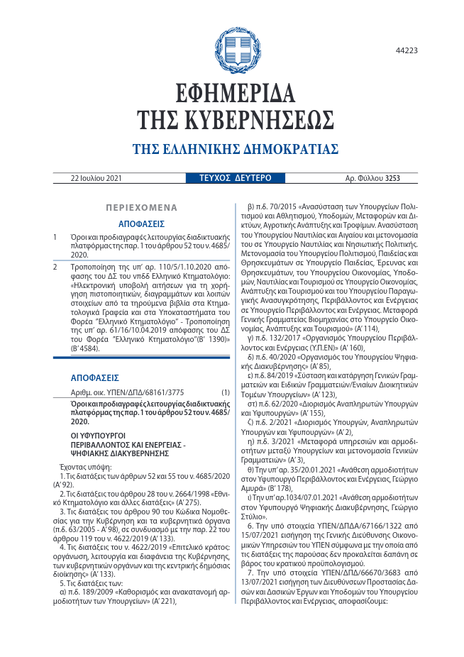 Με την κοινή υπουργική απόφαση, που υπεγράφη και δημοσιεύτηκε στην Εφημερίδα της Κυβέρνησης, (ΦΕΚ τεύχος Β αριθμ, 3253 της 22 Ιουλίου 2021) καθορίστηκαν οι όροι και οι προδιαγραφές λειτουργίας της νέας διαδικτυακής πλατφόρμας που θα δηλώνονται τα αυθαίρετα στα δάση. Με την απόφαση οι ιδιοκτήτες αυθαιρέτων σε δάση καλούνται να υποβάλλουν οικειοθελώς αίτηση καταγραφής της ιδιοκτησίας τους, προκειμένου να τεθούν σε καθεστώς ειδικής προστασίας, το οποίο έχει θεσμοθετηθεί με τον πρόσφατο πολεοδομικό χωροταξικό πολεοδομικό νόμο του ΥΠΕΝ (άρθρο 55 του νόμου 4685/2020) και ουσιαστικά ισχύει επ΄αόριστον!