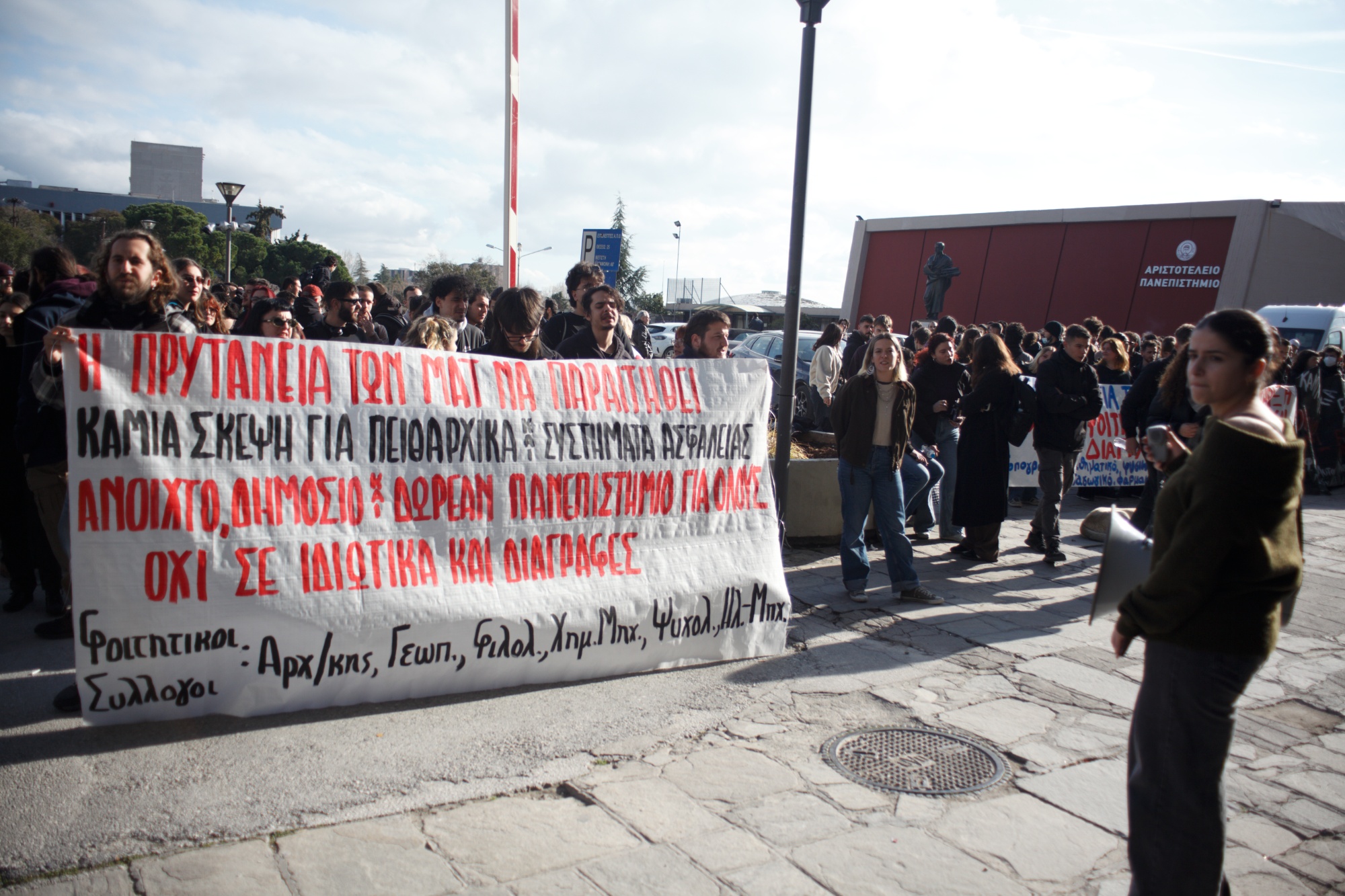 Κινητοποίηση ενάντια στις πειθαρχικές διώξεις, τα σχέδια ασφαλείας που έχουν εξαγγείλει οι πρυτανικές αρχές αλλά και τις διαγραφές φοιτητών-τριών πραγματοποίησαν φοιτητές-τριες και φοιτητικοί σύλλογοι το μεσημέρι της Τετάρτης έξω από την πρυτανεία του ΑΠΘ, λίγες μέρες μετά το κρεσέντο καταστολής που εξαπέλυσε η αστυνομία με περισσότερες από 300 προσαγωγές στο Πολυτεχνείο.