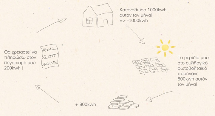 Σχηματική αναπαράσταση του μοντέλου του εικονικού ενεργειακού συμψηφισμού. Ενεργειακή Κοινότητα ΥΠΕΡΙΩΝ