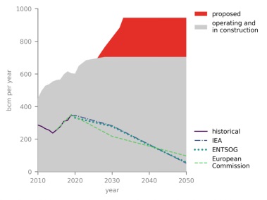 Μετά τον πόλεμο στην Ουκρανία, η Ευρωπαϊκή Ένωση μπήκε σε μια φρενήρη κούρσα απόκτησης όσο το δυνατόν περισσότερων ποσοτήτων LNG για να εξασφαλίσει την ενεργειακή της ασφάλεια και να απεξαρτηθεί από το ρωσικό αέριο. Αυτό υπήρξε εξαιρετική ευκαιρία για τις εταιρίες ορυκτών καυσίμων προκειμένου να πιέσουν και να πετύχουν αδειοδοτήσεις και χρηματοδότηση για ακόμα περισσότερα έργα (αγωγούς, αλλά κυρίως τερματικούς σταθμούς LNG). Ωστόσο ο μύθος περί της ανάγκης για περισσότερες υποδομές αερίου και LNG καταρρίπτεται από τις προβλέψεις της ΕΕ. Στο παρακάτω γράφημα φαίνεται ξεκάθαρα ότι οι υποδομές που ήδη λειτουργούν ή βρίσκονται στο στάδιο της κατασκευής είναι πολλαπλάσιες των προβλέψεων για την κατανάλωση LNG στο μέλλον.