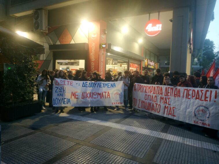Οι εργαζόμενοι συγκεντρώθηκαν έξω από το κατάστημα βροντοφωνάζοντας “νόμος είναι το δίκιο του εργάτη, του απεργού, του άνεργου και του μετανάστη” και “για μια μπουκιά ψωμί σου πίνουνε το αίμα, εργάτη, σήκω, τ’ αφεντικά πολέμα”.