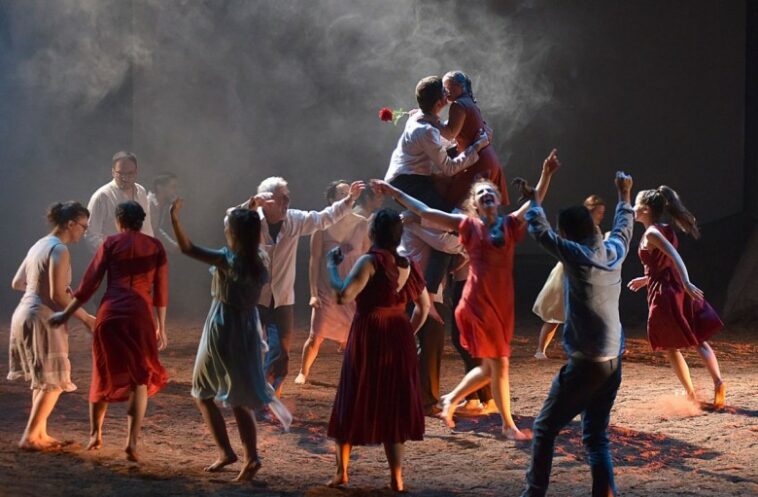 Δεύτερο, κάτι για το οποίο δεν είμαι σίγουρος ότι ισχύει, ούτε έχω το υπόβαθρο να το στηρίξω, αλλά θα το πω όπως το κατάλαβα. Η σκηνοθεσία δοκιμάζει, συνειδητά νομίζω, κάτι πραγματικά νέο κι ενδιαφέρον (και, σε συνέχεια των παραπάνω, δεν το δοκιμάζει για να το δοκιμάσει, για να μας το δείξει ή για να δειχθεί, το δοκιμάζει γιατί το χρειάζεται). Δουλεύει με έναν χορό, από τον οποίο τα πρόσωπα βγαίνουν λίγο, ίσα-ίσα ξεμυτίζουν, χωρίς καν να στέκονται απέναντί του, για να ξαναγυρίζουν πάντα σε αυτό. Με αυτή την έννοια, όχι μόνο ξεφεύγει από όλη τη δυτική παράδοση του ήρωα – ατόμου, αλλά πηγαίνει ίσως πίσω και από το θέατρο της κλασικής αρχαιότητας, πίσω από τη στιγμή που ο ηθοποιός στάθηκε απέναντι από το χορό. Και το κάνει σε μια παράσταση που εύκολα θα νόμιζε κάποιος ότι θέλει να αναδείξει το άτομο και την ιδιαιτερότητά του. Όχι, το αντίθετο μάλλον θέλει να κάνει.