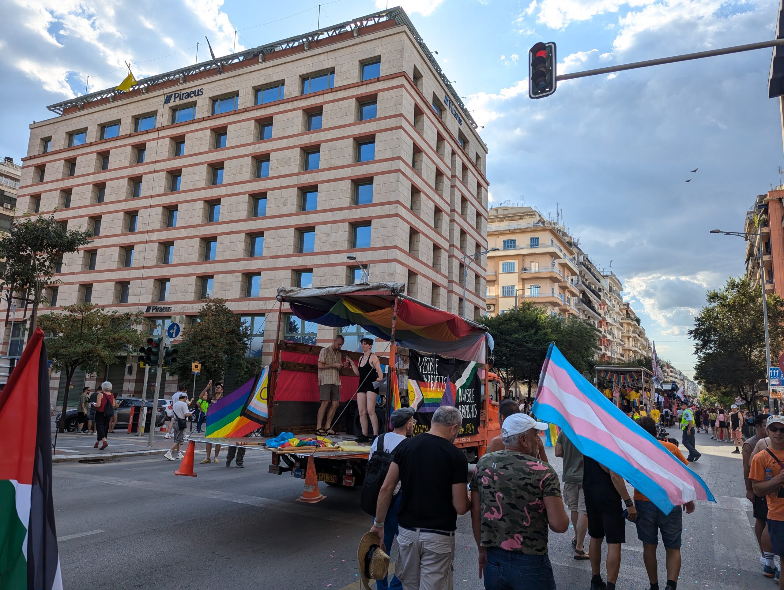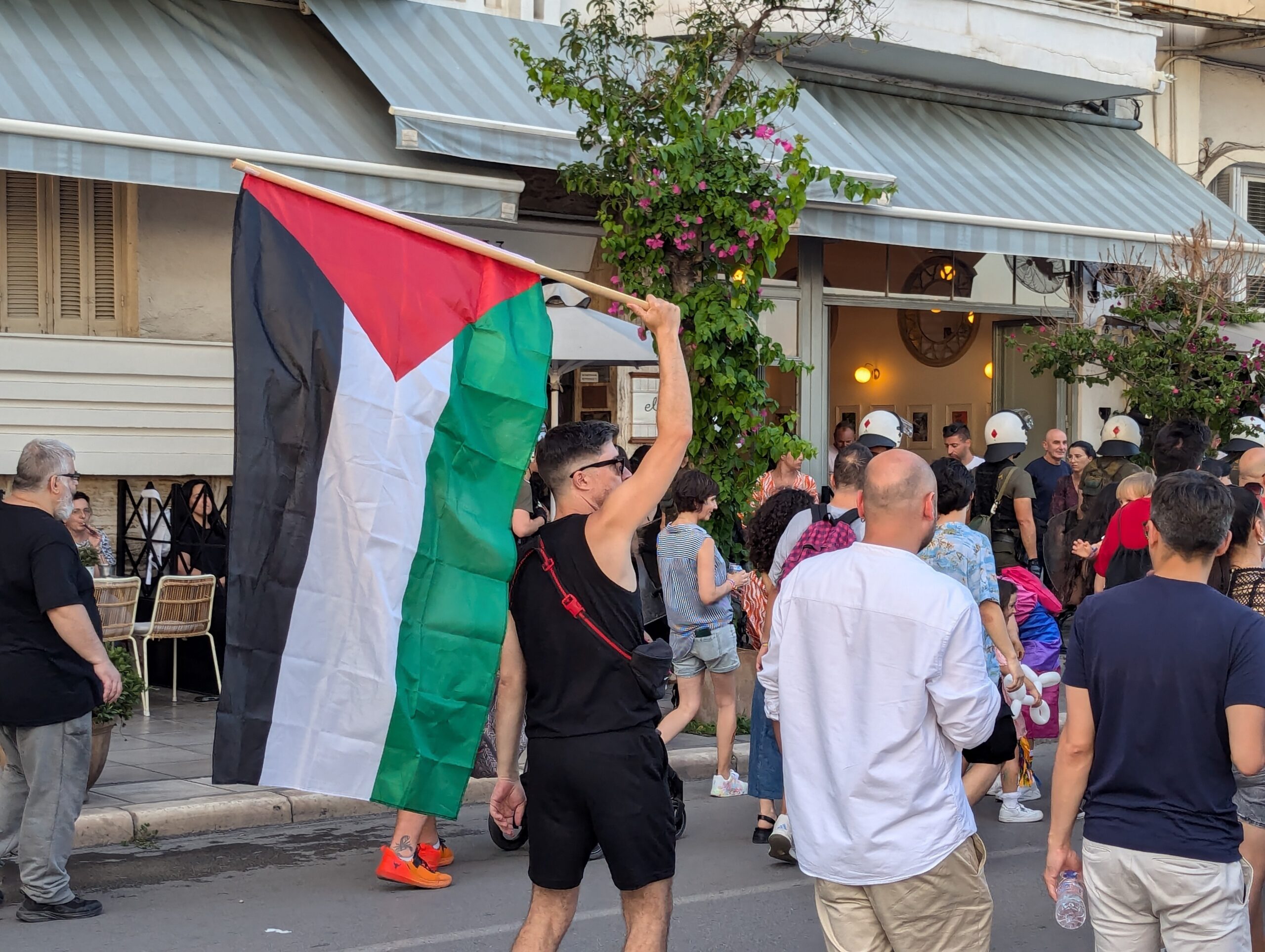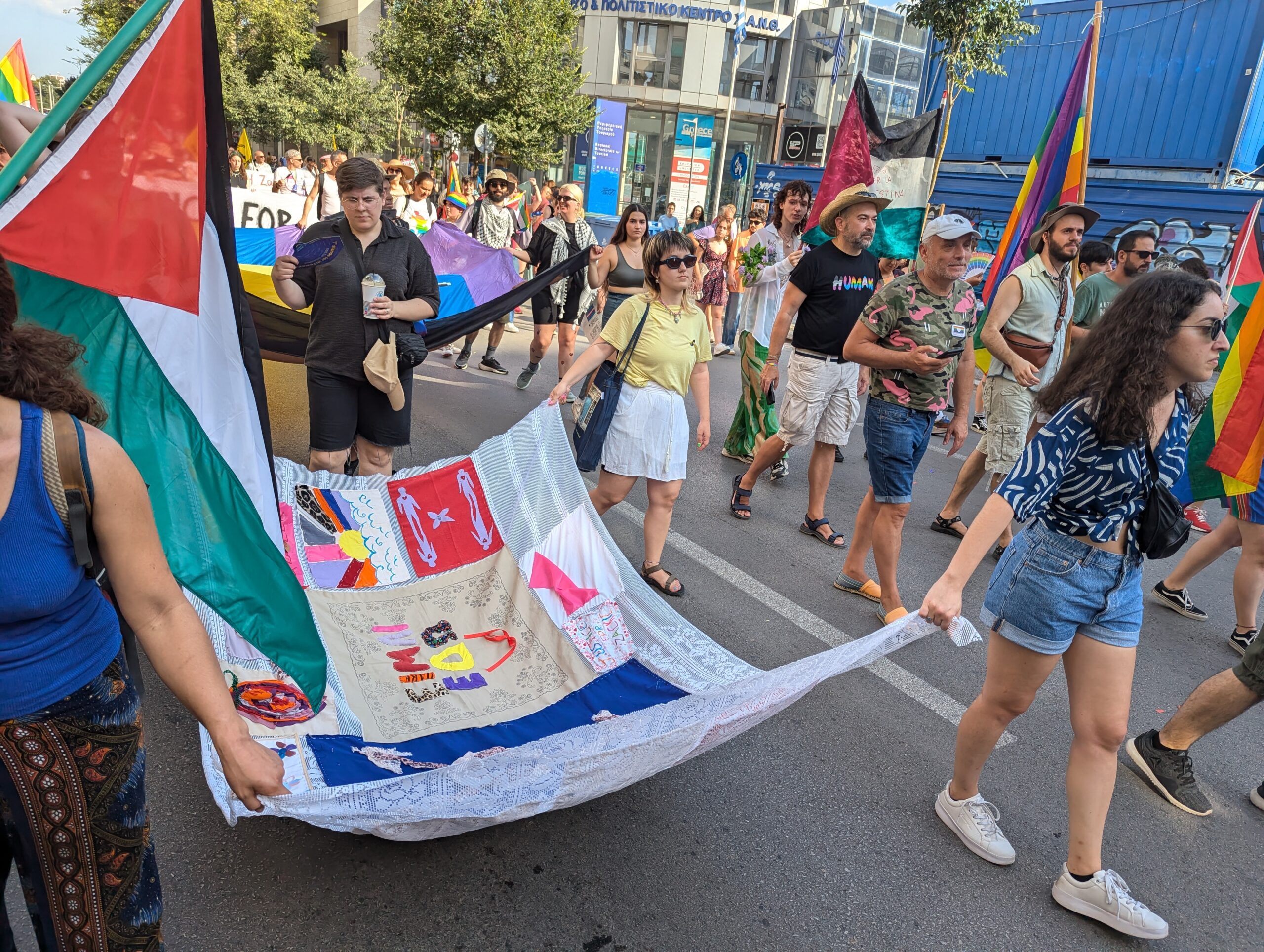 Από την πορεία υπερηφάνειας δεν έλειψε η σημαία της Παλαιστίνης, καθώς πολλοί και πολλές επέλεξαν να κρατούν μια σε ένδειξη αλληλεγγύης στον λαό της Παλαιστίνης.