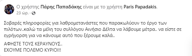 Συγκεκριμένα σε ανάρτησή του στο facebook αναφέρει ότι υπάρχουν «σοβαρές πληροφορίες για λαθρομετανάστες που παρακωλύουν το έργο των πιλότων» καλώντας τα μέλη του συλλόγου Αινήσιο Δέλτα να λάβουν μέτρα…
