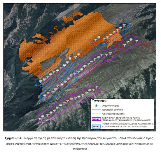 Ομοίως, επισημαίνει «με πρόσφατη εγκύκλιό του (20/12/2024) ο Γ.Γ. Δασών Ευστ. Σταθόπουλος, επιχειρεί να διευκολύνει, παραβιάζοντας την προστασία του περιβάλλοντος, την εγκατάσταση των ανεμογεννητριών, μέσα από την ποδηγέτηση των Δασαρχείων της χώρας κατά τη διαδικασία έγκρισης μελετών περιβαλλοντικών επιπτώσεων για εγκατάσταση ανεμογεννητριών σε απάτητα βουνά, αφού στη συγκεκριμένη εγκύκλιο αναφέρει ότι η διάνοιξη οδών για έργα ΑΠΕ έχει προστατευτικό για τις πυρκαγιές ρόλο. Άρα, τα Δασαρχεία, εμμέσως πλην σαφώς, καλούνται να γνωμοδοτούν θετικά, προκειμένου σε περίπτωση πυρκαγιάς να μην κατηγορηθούν ότι έχουν ευθύνη, αφού αγνόησαν τον “προστατευτικό” ρόλο των δρόμων που θα ανοίγονταν για την εγκατάσταση και λειτουργία των ΑΠΕ». (Δείτε περισσότερα για το θέμα στο ρεπορτάζ του Τάσου Σαραντή στην Εφημερίδα των Συντακτών και στο dasarxeio.com)