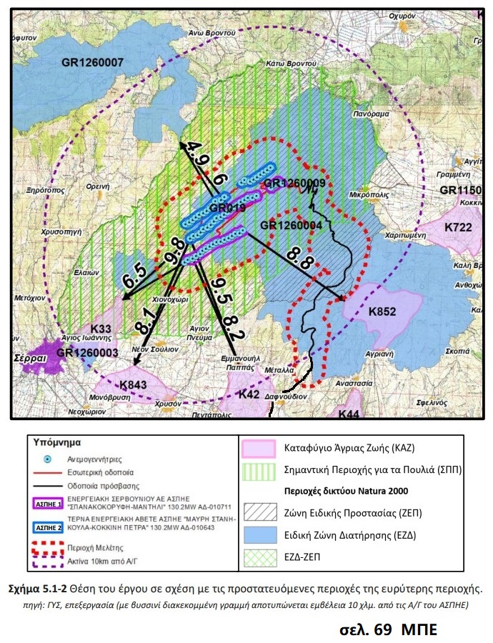 Σε αυτήν τονίζεται ότι στην περιοχή, που συμπεριλαμβάνεται στο δίκτυο Natura2000, καταγράφηκαν 14 είδη άγριων πτηνών του Παραρτήματος Ι της Οδηγίας 2009/147/ΕΕ, εκ των οποίων τα 6 είδη συγκαταλέγονται στο Ελληνικό Κόκκινο Βιβλίο σε κάποιο καθεστώς απειλής. Σημειώνεται η παρουσία 2 ειδών ως Κινδυνεύοντα (ο Χρυσαετός-Aquila chrysaetos και ο Γερακαετός-Aquila pennata), 1 είδους ως Τρωτά (η Πετροπέρδικα-Alectoris graeca) και 2 ειδών ως Σχεδόν Απειλούμενα (η Σιταρήθρα-Alauda arvensis και ο Φιδαετός-Circaetus gallicus). Επιπλέον, η περιοχή εγκατάστασης των α/γ εμπίπτει εντός επικράτειας 21 ειδών Χειροπτέρων (νυχτερίδες), εκ των οποίων τα 8 είναι ευάλωτα.