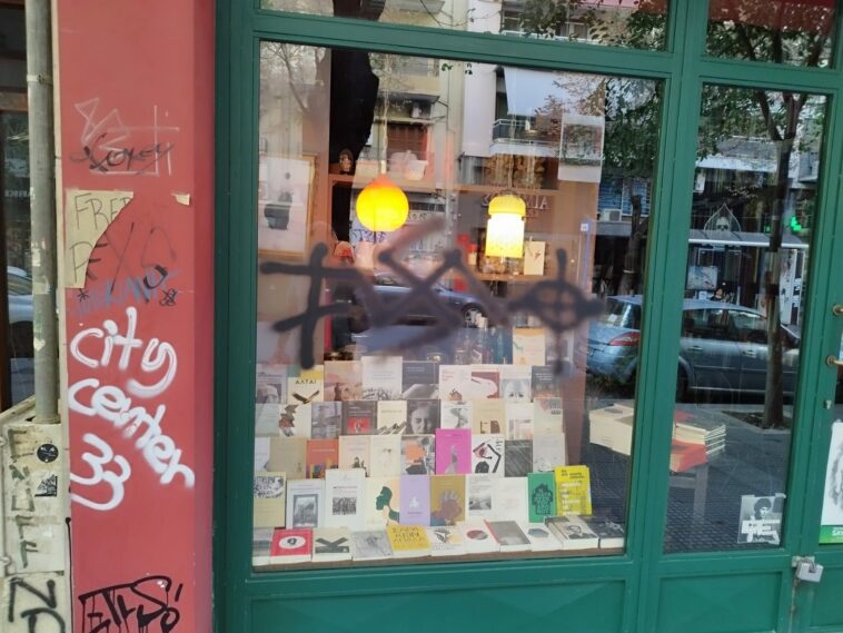 Με φασιστικό αγκυλωτό σταυρό και με κέλτικο σταυρό βρομίστηκε η βιτρίνα του γνωστού συνεργατικού βιβλιοπωλείου της Θεσσαλονίκης Ακυβέρνητες Πολιτείες, υπενθυμίζοντας την ανάγκη αντιφασιστικής εγρήγορσης της κοινωνίας της πόλης, σε όλα τα επίπεδα.