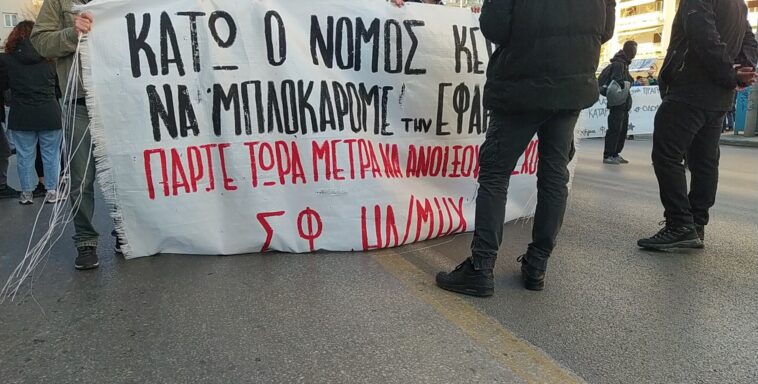 Για άλλη μία φορά όμως, η αστυνομία, απέκλεισε την οδό Εγνατία, στήνοντας φραγμό με κλούβες και πολυάριθμες αστυνομικές δυνάμεις, με την πορεία τελικά να καταλήγει στην Καμάρα.