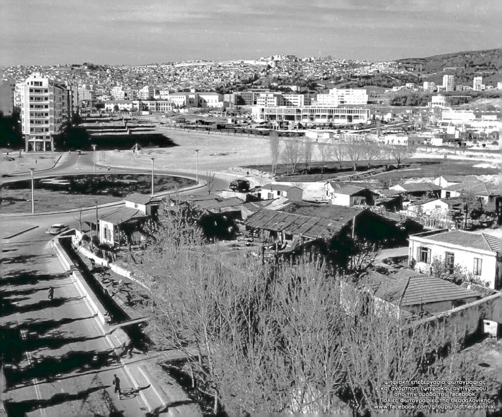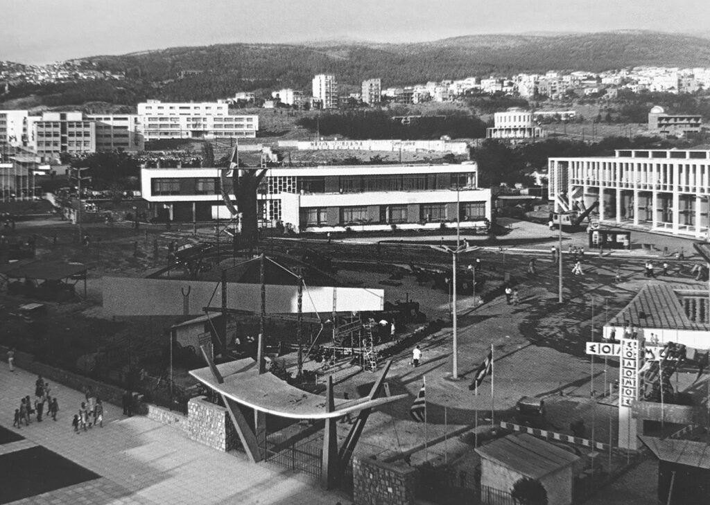 Εικ. 15: Η ΔΕΘ τη δεκαετία του ‘50, σε πρώτο πλάνο η πλατεία της ΧΑΝΘ και στο βάθος το Περίπτερο 1. Η εικόνα αποκαλύπτει όλον τον χώρο που μπορεί να μείνει ελεύθερος μετά την κατεδάφιση των υπολοίπων περιπτέρων.
