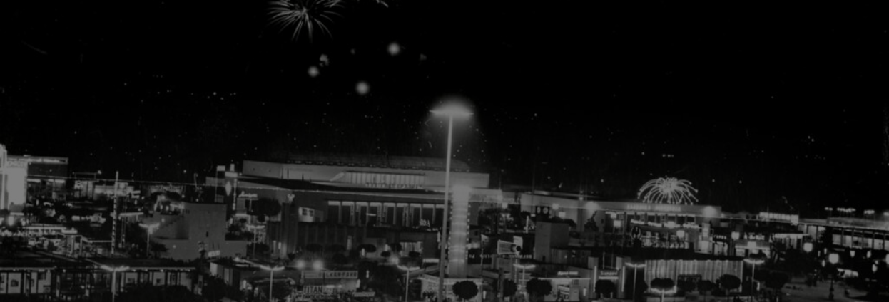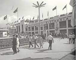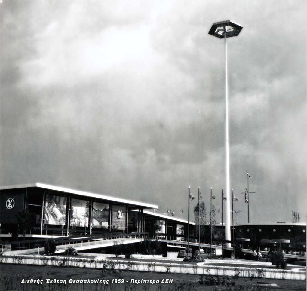 Εικ. 1: Από εγκαίνια της ΔΕΘ, τη δεκαετία του 1950. Σε πρώτο πλάνο το φωταγωγημένο περίπτερο της ΔΕΗ (σήμερα Μακεδονικό Μουσείο Σύγχρονης Τέχνης)