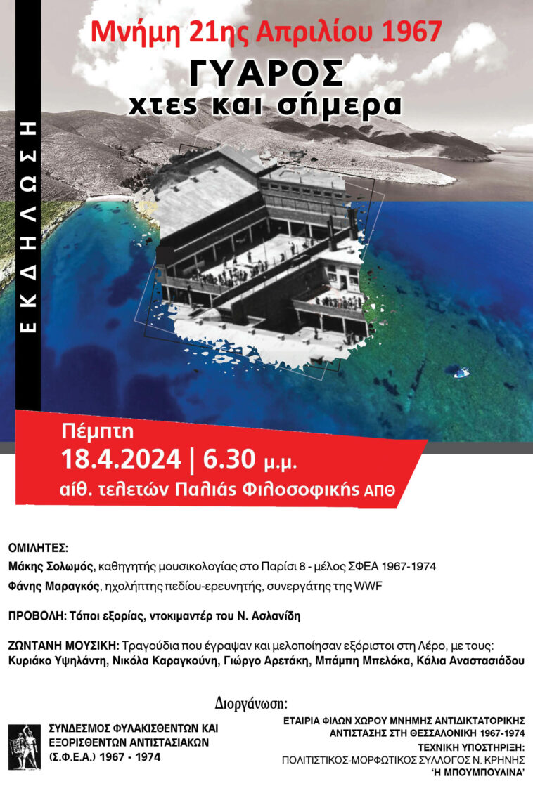 Ο ΣΦΕΑ 1967-1974, εν όψει της 57ης επετείου του πραξικοπήματος των συνταγματαρχών στις 21/4/1967, θα πραγματοποιήσει εκδήλωση στις 18 Απριλίου 2024, στις 6.30 μ.μ., στην αίθουσα τελετών της παλαιάς Φιλοσοφικής Σχολής του ΑΠΘ, που θα είναι τιμητικά αφιερωμένη στους 7.500 και πλέον δημοκρατικούς πολίτες, ανάμεσά τους 300 γυναίκες – πολλές άφησαν πίσω μικρά παιδιά – που εξορίστηκαν στη Γύαρο (Γιούρα) την περίοδο της 7χρονης τυραννίας – μεταξύ τους και 500 περίπου ‘προληπτικώς εκτοπισθέντες’ από την περιοχή Θεσσαλονίκης και τη Β.Ε.