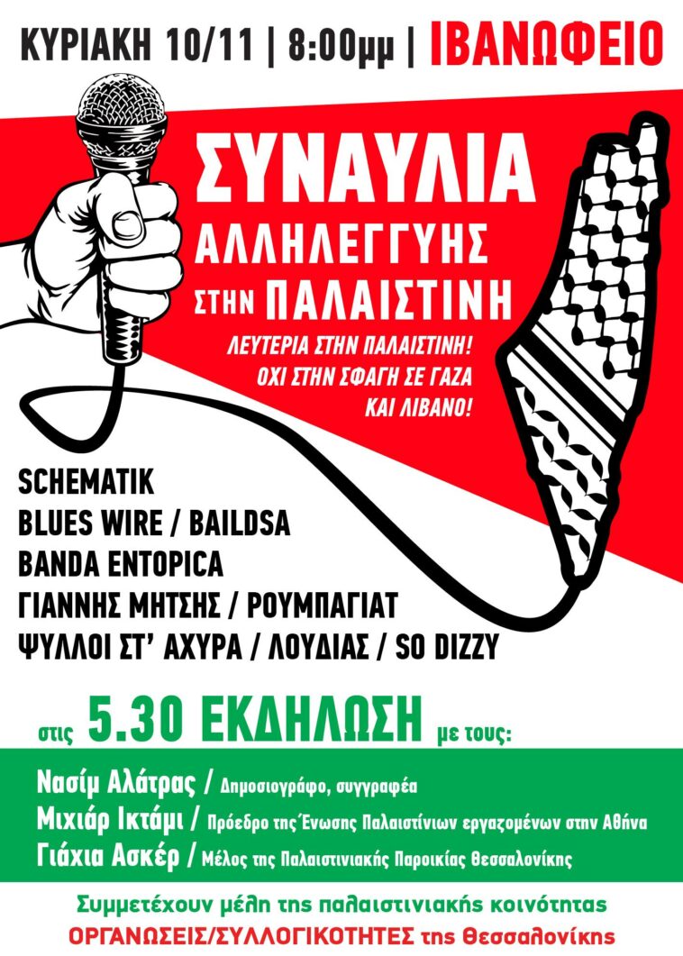 Συναυλία Αλληλεγγύης στην Παλαιστίνη και εκδήλωση στο Ιβανώφειο διοργανώνουν την Κυριακή από κοινού οργανώσεις και συλλογικότητες της Θεσσαλονίκης μαζί με μέλη της Παλαιστινιακής Κοινότητας. «Η Αλληλεγγύη στην Παλαιστίνη είναι υπόθεση όλων μας» τονίζουν οι οργανώσεις υπενθυμίζοντας ότι το κράτος του Ισραήλ συνεχίζει να δολοφονεί μαζικά και με την υποστήριξη των Αμερικάνων και της Ευρωπαϊκής Ένωσης στη Λωρίδα της Γάζας, ενώ κλιμακώνει τους εκτοπισμούς και τις δολοφονίες στη Δυτική Όχθη. Το απόγευμα της Τρίτης στη Θεσσαλονίκη πραγματοποιήθηκε ακόμη μια διαδήλωση αλληλεγγύης στην Παλαιστίνη με τη συμμετοχή πλήθους οργανώσεων και συλλογικοτήτων.