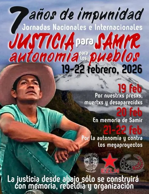 Ο EZLN, το Εθνικό Ιθαγενικό Κογκρέσο και το Μέτωπο των Λαών για την Υπεράσπιση της Γης και του Νερού σε Μορέλος, Πουέμπλα, Τλαξκάλα καλούν με κοινή τους ανακοίνωση σε 4 ημέρες δράσης (19, 20, 21 και 22 Φεβρουαρίου) στη μνήμη του ιθαγενή συντρόφου Σαμίρ Φλόρες, που δολοφονήθηκε πριν από 7 χρόνια γιατί αγωνιζόταν για την υπεράσπιση της γης και ενάντια στα καταστροφικά «μεγάλα έργα» της κυβέρνησης.