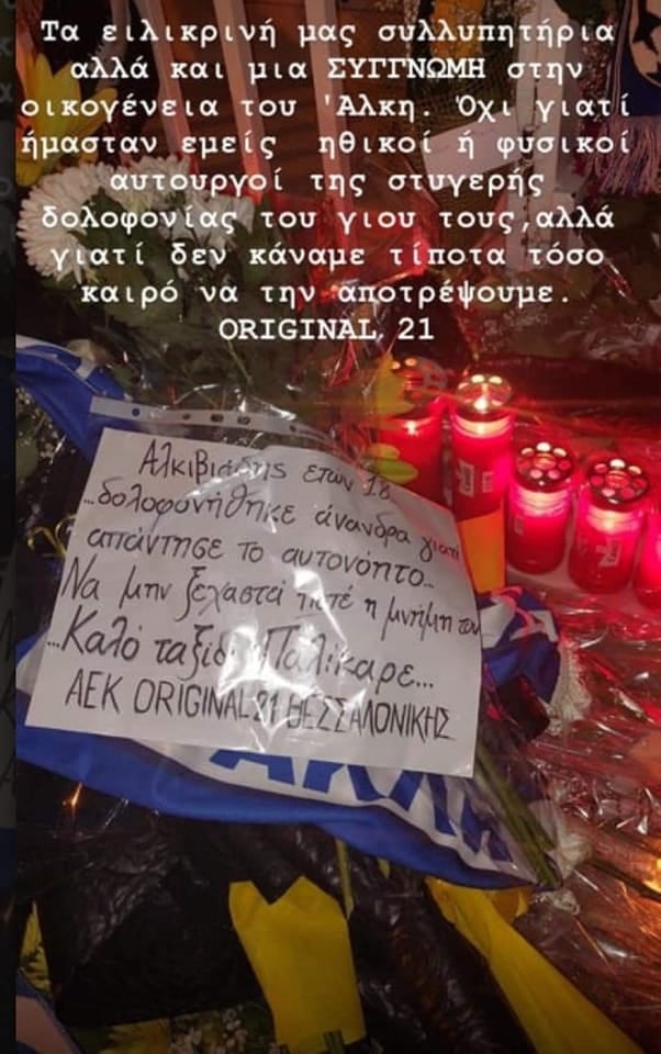 Τα ειλικρινή μας συλλυπητήρια αλλά και μια συγγνώμη στην οικογένεια του ‘Αλκη. Όχι γιατί ήμασταν εμείς ηθικοί ή φυσικοί αυτουργοί της στυγερής δολοφονίας του γιου τους…αλλά γιατί δεν κάναμε τίποτα τόσο καιρό να την αποτρέψουμε.