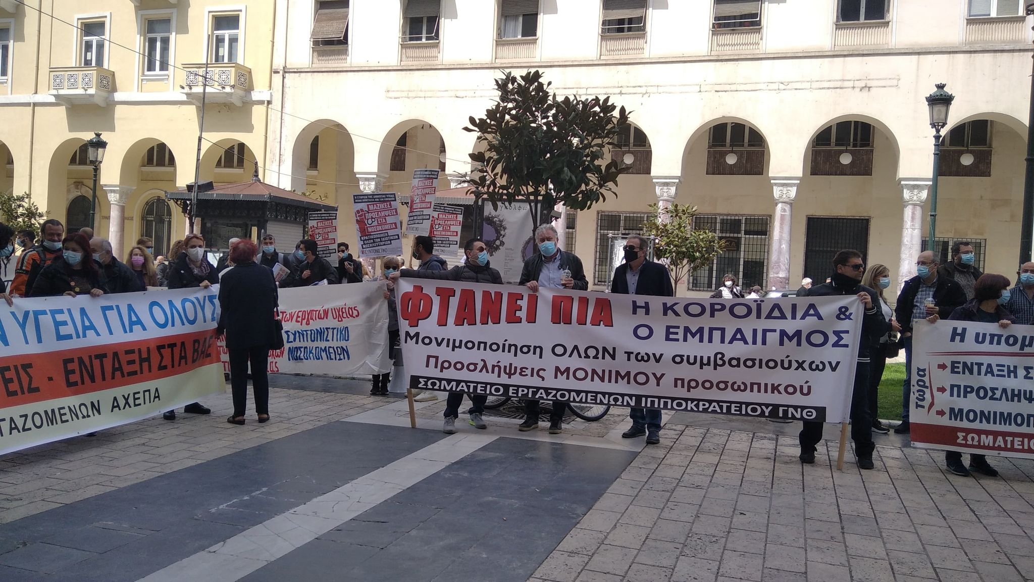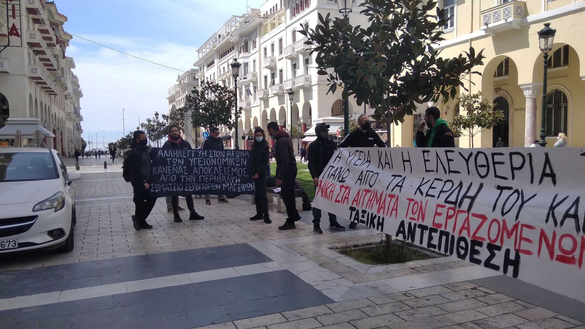 Από την πλευρά της η Ελένη Μπακιρλή, μέλος του σωματείου του ΑΧΕΠΑ και μέλος του Γ. Σ της ΠΟΕΔΗΝ δήλωσε: «Όλα τριγύρω αλλάζουν και όλα τα ίδια μένουν. Έχουν χαθεί τόσες ζωές και η κυβέρνηση επιμένει να μην επιτάσσει τις ιδιωτικές κλινικές. Τα νοσοκομεία είναι νοσοκομεία μίας νόσου, και εξετάσεις, όπως επείγουσες στεφανιογραφίες, δε μπορούν να γίνουν». Αναφέρθηκε, ακόμη, στη τρομοκρατία των διοικήσεων των νοσοκομείων εναντίον συνδικαλιστών και άλλων εργαζόμενων γιατί, όπως είπε, «δε θέλουν να βγαίνει προς τα έξω η πραγματική κατάσταση των νοσοκομείων».