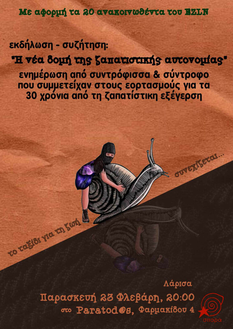 Δύο εκδηλώσεις για τη νέα δομή της ζαπατιστικής αυτονομίας με αφορμή τα 20 ανακοινωθέντα του EZLN θα πραγματοποιηθούν την Παρασκευή 23 Φλεβάρη και το Σάββατο 24 Φλεβάρη στη Λάρισα και τη Θεσσαλονίκη αντίστοιχα.
