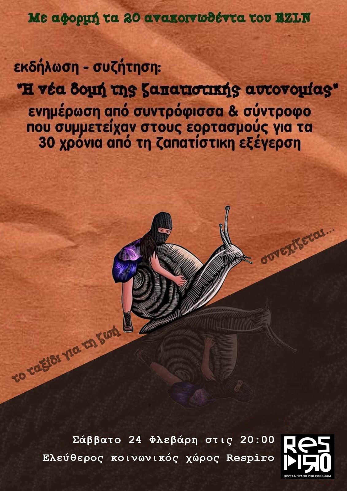 Την Παρασκευή 23 Φλεβάρη στις 20:00 στο στέκι paratodos (Φαρμακίδου 4) ενημερωνόμαστε για την νέα μορφή οργάνωσης και διοίκησης των ζαπατιστικων κοινοτήτων, για την νέα δομή της ζαπατιστικης αυτονομίας. Μοιράζονται μαζί μας τις εμπειρίες τους από το ταξίδι και την συμμετοχή στους εορτασμούς για τα 30 χρόνια από την ζαπατιστικη εξέγερση σύντροφοι και συντρόφισσες από τον ελλαδικό χώρο.