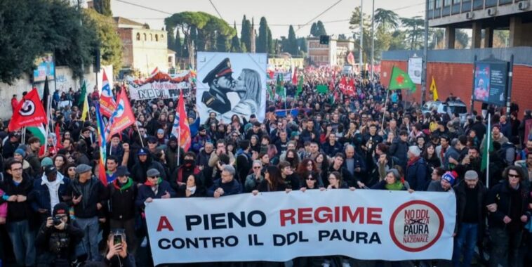Στο κέντρο οι εργάτες του εργοστασίου Gkn της Φλωρεντίας με το μεγάλο πανό «Ας ξεσηκωθούμε». «Όσο περισσότερο μας ποινικοποιούν, τόσο περισσότερο πρέπει να μείνουμε ενωμένοι και ενωμένες – εξηγούν – Αυτό το νομοσχέδιο είναι εδώ για να μας εμποδίσει να μετασχηματίσουμε την κοινωνία με τον αγώνα μας». Ο Christopher Ceresi των «κοινωνικών δήμων» της Μπολόνια το έθεσε έτσι, μιλώντας από το φορτηγό: «Αυτή είναι η πρώτη αληθινή, μεγάλη, αντιπολιτευτική διαδήλωση στην κυβέρνηση Μελόνι».