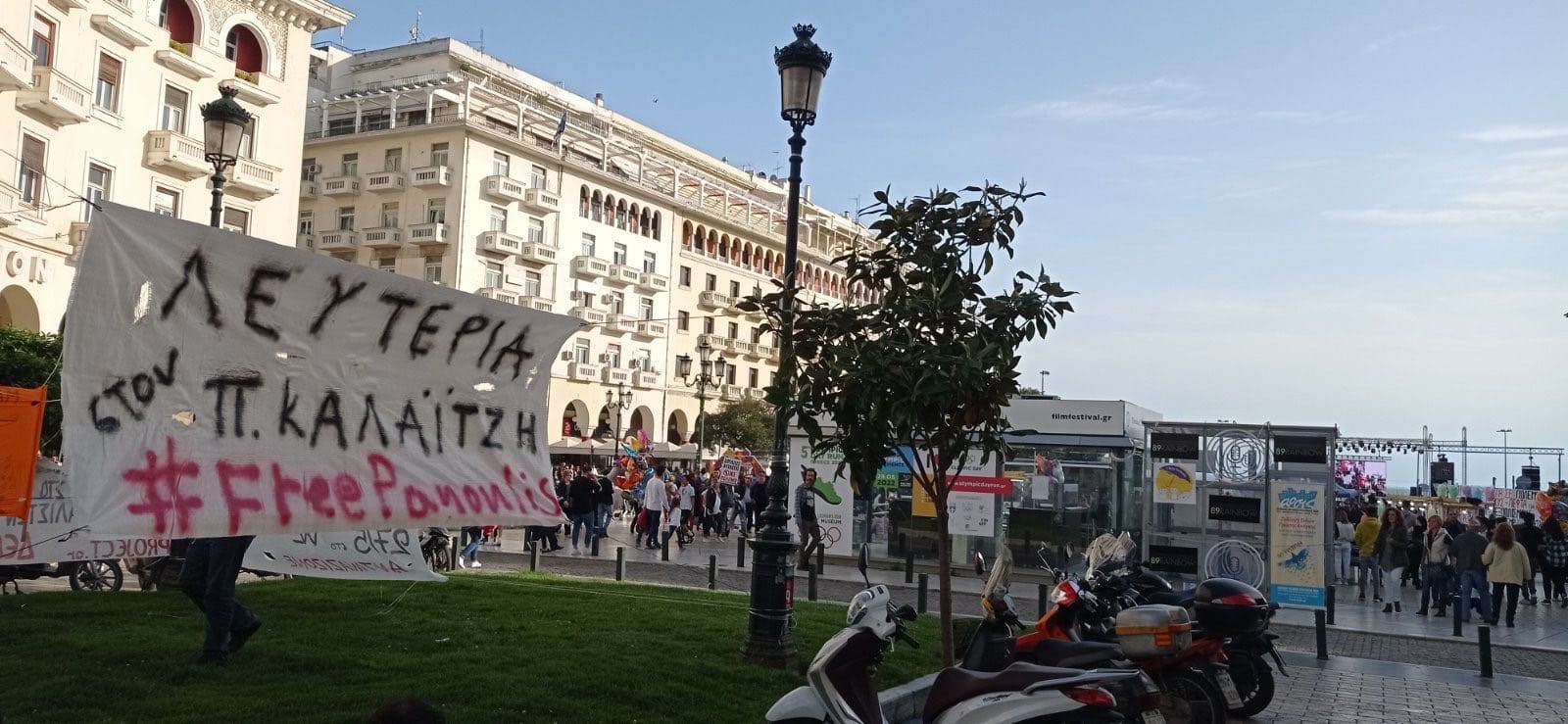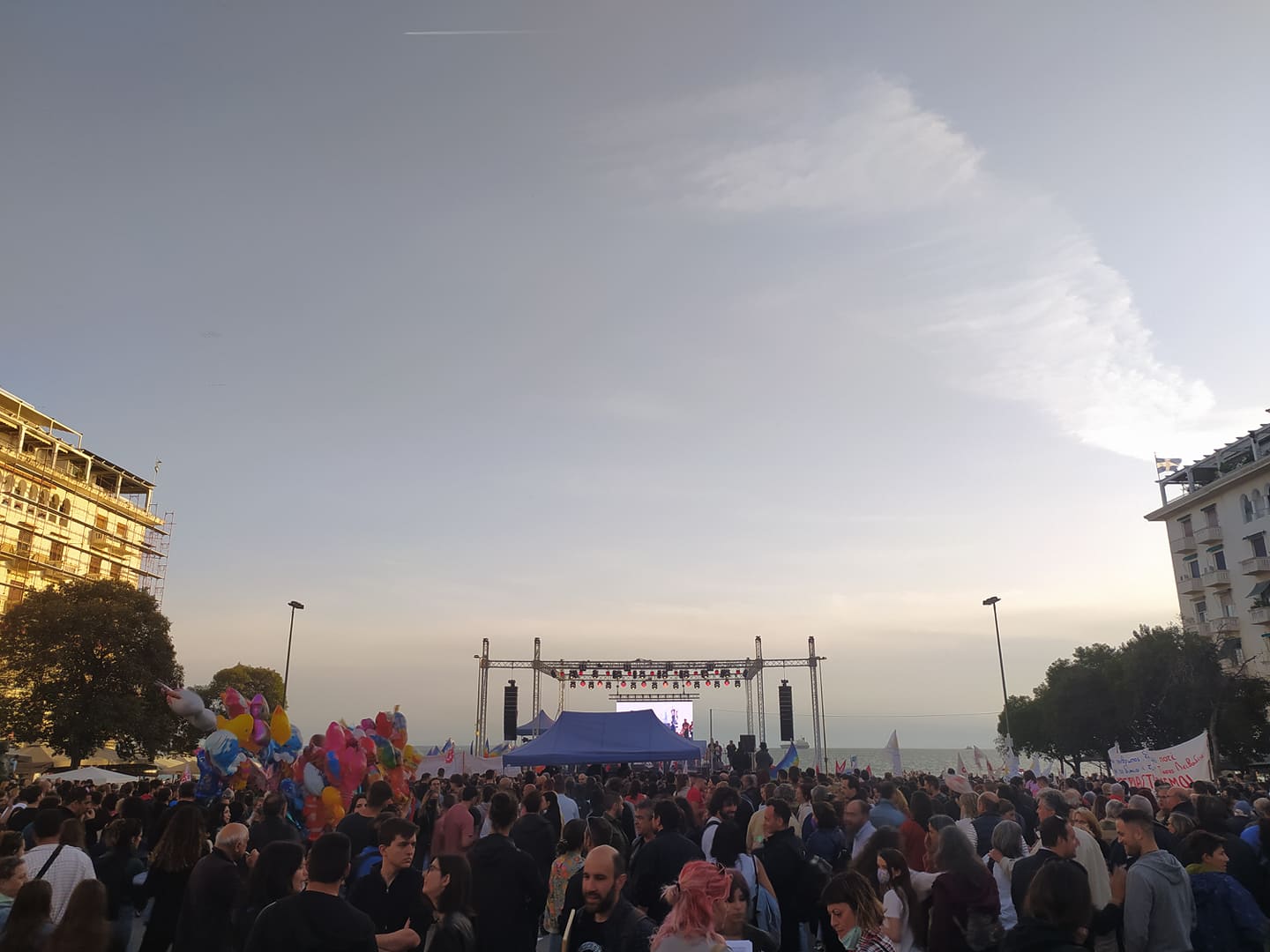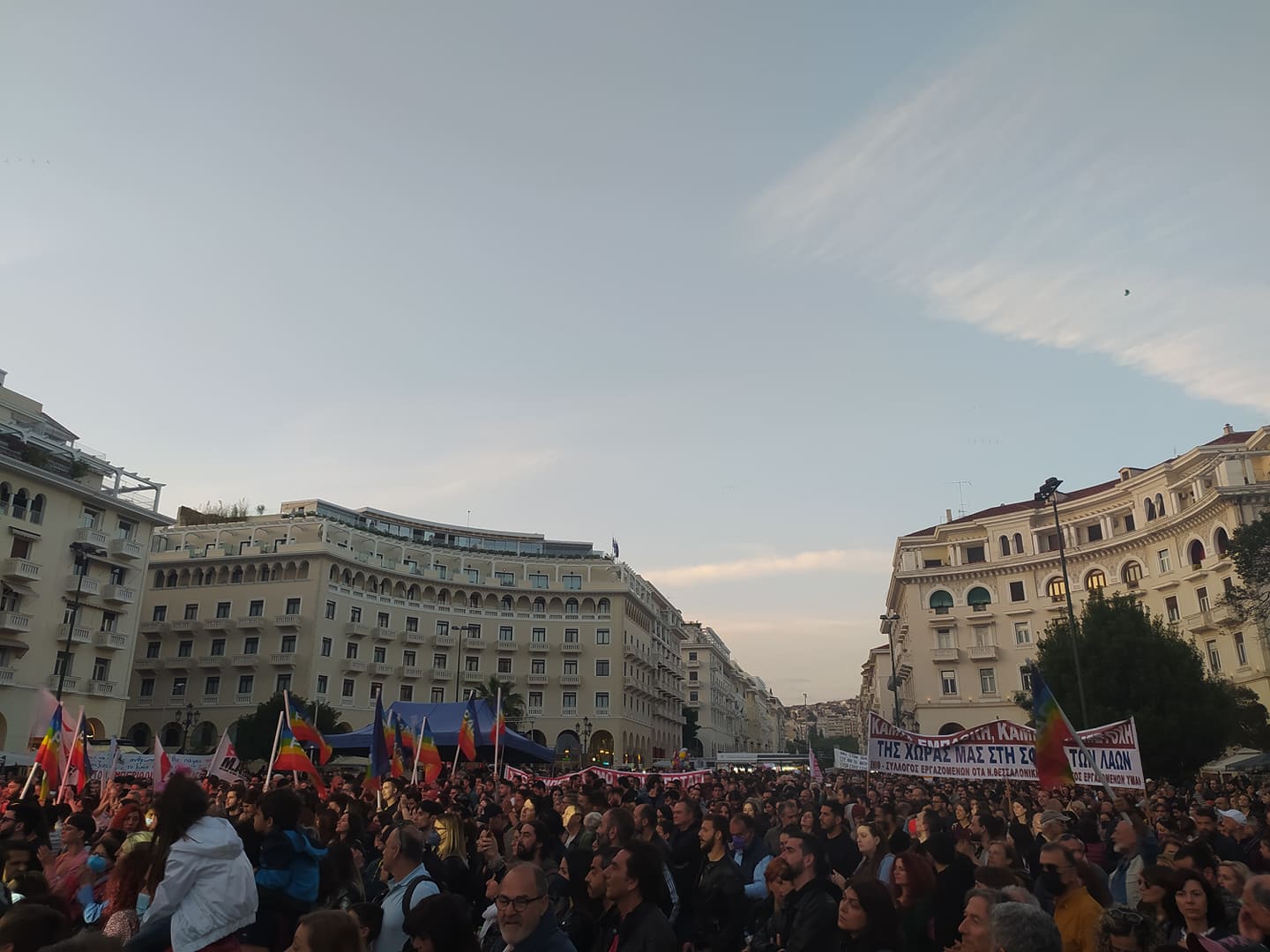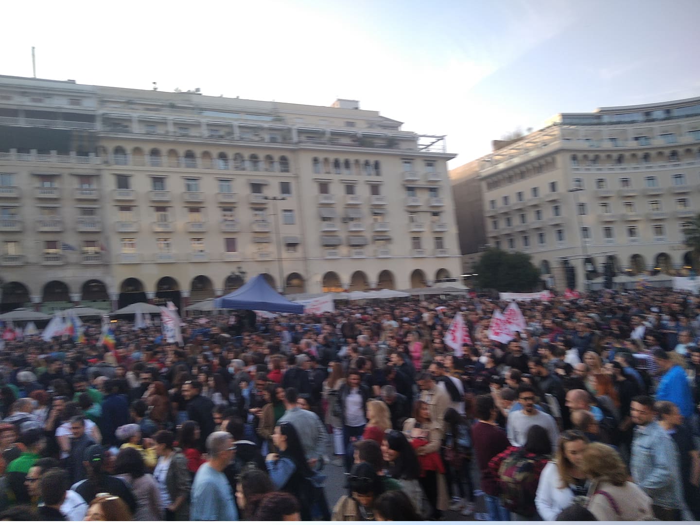 Πολύχρωμες σημαίες με το σήμα της ειρήνης, πανό και πλακάτ συνδικάτων, φοιτητικών συλλόγων, μαθητικών σχημάτων και πολιτικών οργανώσεων σε όλο τον άξονα της οδού Αριστοτέλους που είχε πλημμυρίσει από κόσμο όλων των ηλικιών, έφεραν στους παλιότερους μνήμες των μαζικών διαδηλώσεων της διετίας 2010-2012 και έγιναν πομποί και δέκτες του λιτού και περιεκτικού μηνύματος των διοργανωτών σε όλη την πόλη.