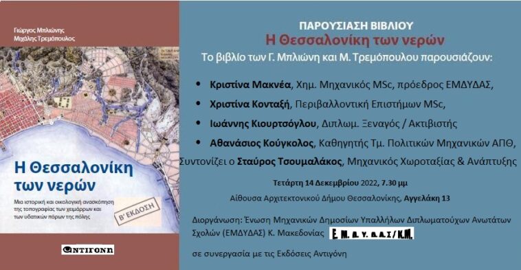 Το Διοικητικό Συμβούλιο της ΕΜΔΥΔΑΣ Κεντρικής Μακεδονίας διοργανώνει σήμερα Τετάρτη14 Δεκεμβρίου, 7.30μμ-10μμ εκδήλωση για τα ρέματα της Θεσσαλονίκης με αφορμή τη νέα έκδοση του βιβλίου «Η Θεσσαλονίκη των νερών» του Γ. Μπλιώνη και του Μ. Τρεμόπουλου. Με αυτήν την εκδήλωση, οι Μηχανικοί του Δημοσίου προσπαθούν να ανοίξουν το θέμα των αστικών ρεμάτων, στην κοινωνία της Θεσσαλονίκης, μέσω διαφορετικών προσεγγίσεων, των ομιλητών και των συμμετεχόντων στην εκδήλωση.