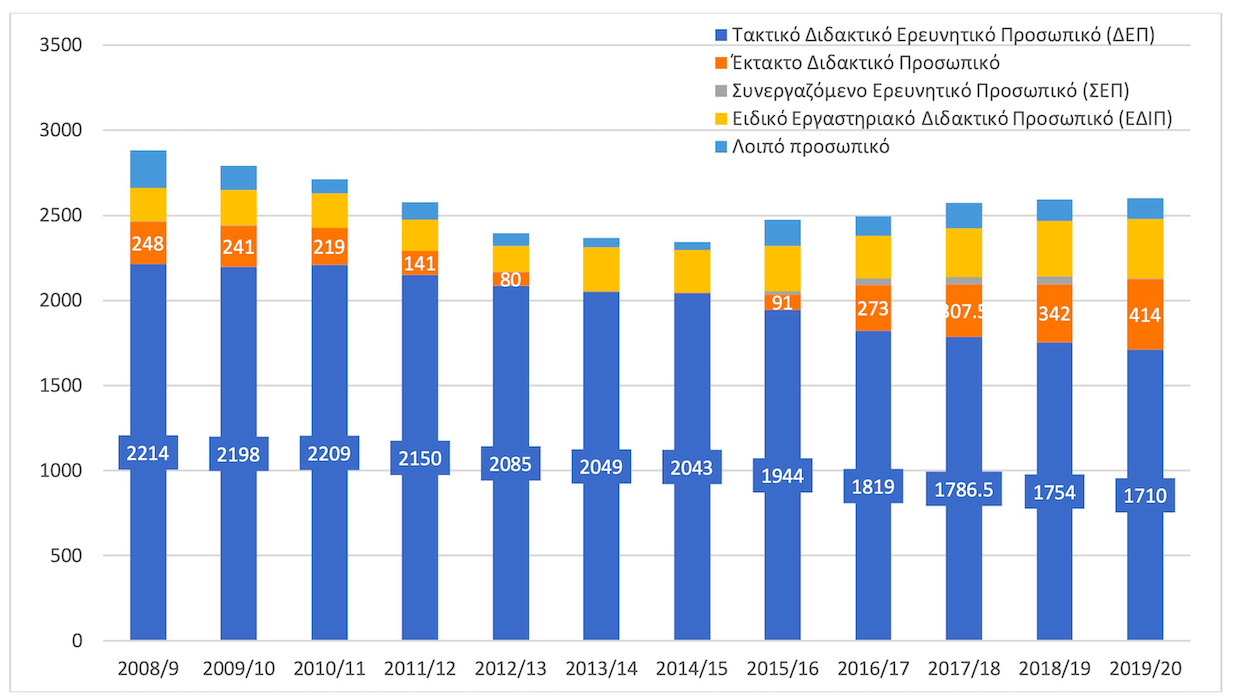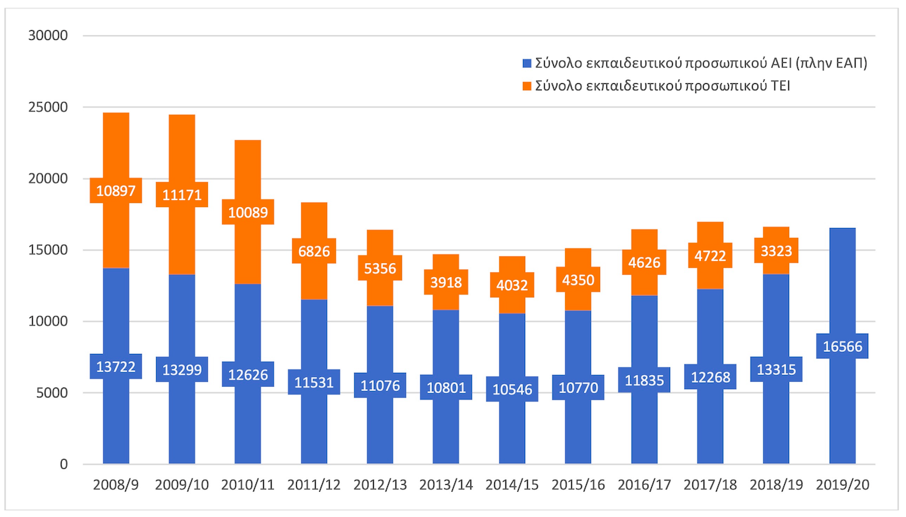 Σημειώσεις: (1) τα στοιχεία αφορούν στη λήξη του κάθε ακαδημαϊκού έτους, (2) στο εκπαιδευτικό προσωπικό των ΑΕΙ δεν έχει συμπεριληφθεί το προσωπικό του Ελληνικού Ανοικτού Πανεπιστημίου (ΕΑΠ), το οποίο στη συντριπτική του πλειοψηφία είναι συνεργαζόμενο εκπαιδευτικό προσωπικό, (3) από το ακαδημαϊκό έτος 2019/20 το διδακτικό προσωπικό των ΤΕΙ καταγράφεται στα τμήματα ΑΕΙ όπου εντάχθηκε.