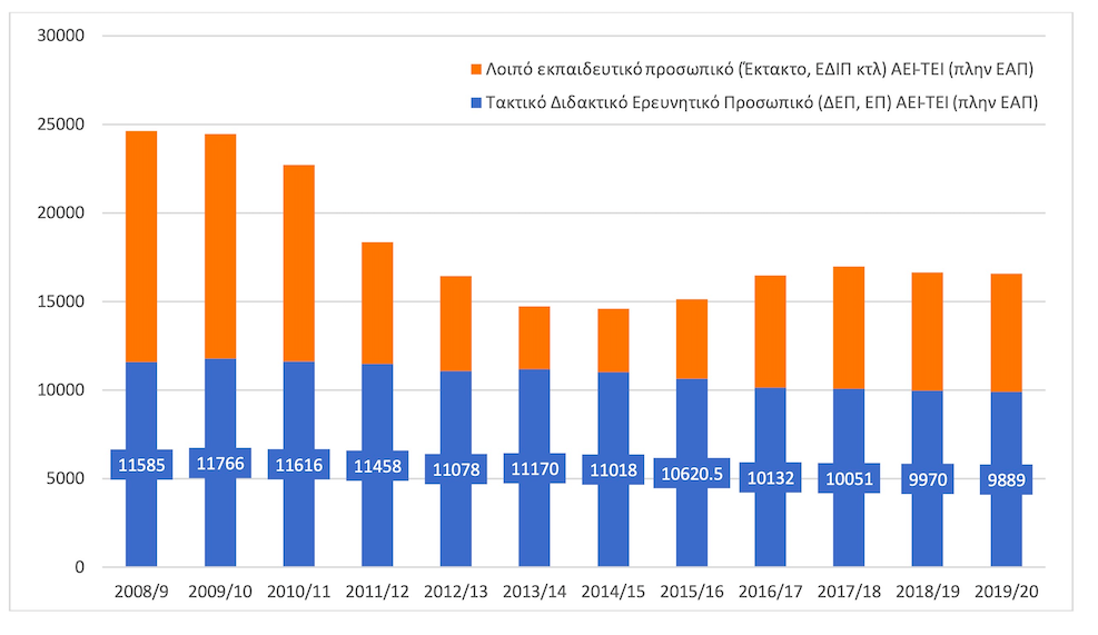 - Το ακαδημαϊκό έτος 2019/20 το τακτικό Διδακτικό Ερευνητικό Προσωπικό (Καθηγητές, Αναπληρωτές Καθηγητές, Επίκουροι Καθηγητές και Λέκτορες) στα δημόσια Πανεπιστήμια της χώρας αριθμούσε 9889 εργαζόμενες/ους, μειωμένο κατά 14.6% σε σχέση με το 2008/9. Κατά τη τελευταία 12ετία από τις 7904 θέσεις εργασίας εκπαιδευτικού προσωπικού που χάθηκαν από τα δημόσια πανεπιστήμια οι 1877 αφορούσαν σε θέσεις εργασίας μελών ΔΕΠ.