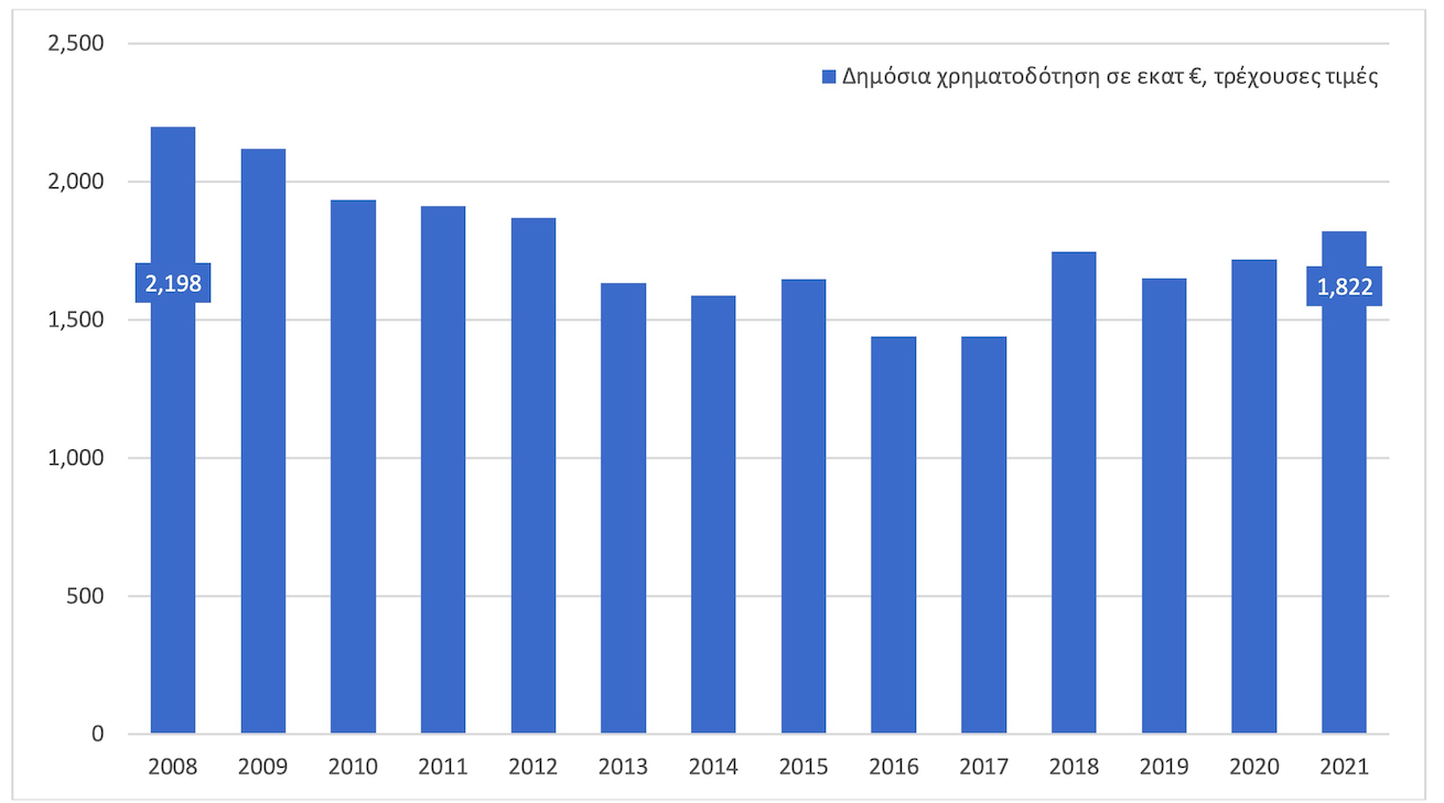 Διάγραμμα 5: Δημόσια χρηματοδότηση Τριτοβάθμιας Εκπαίδευσης, Ελλάδα 2008 – 2021