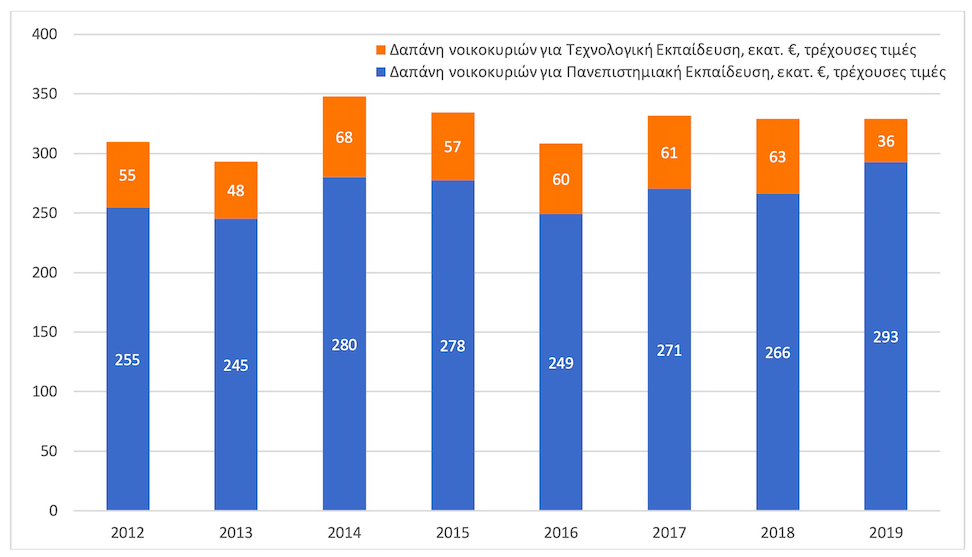- Το 2019, η δαπάνη των νοικοκυριών για τριτοβάθμια εκπαίδευση (τεχνολογικές και πανεπιστημιακές σπουδές) ανερχόταν σε 329 εκατομμύρια ευρώ, 6.2% υψηλότερη σε σχέση με το 2012.