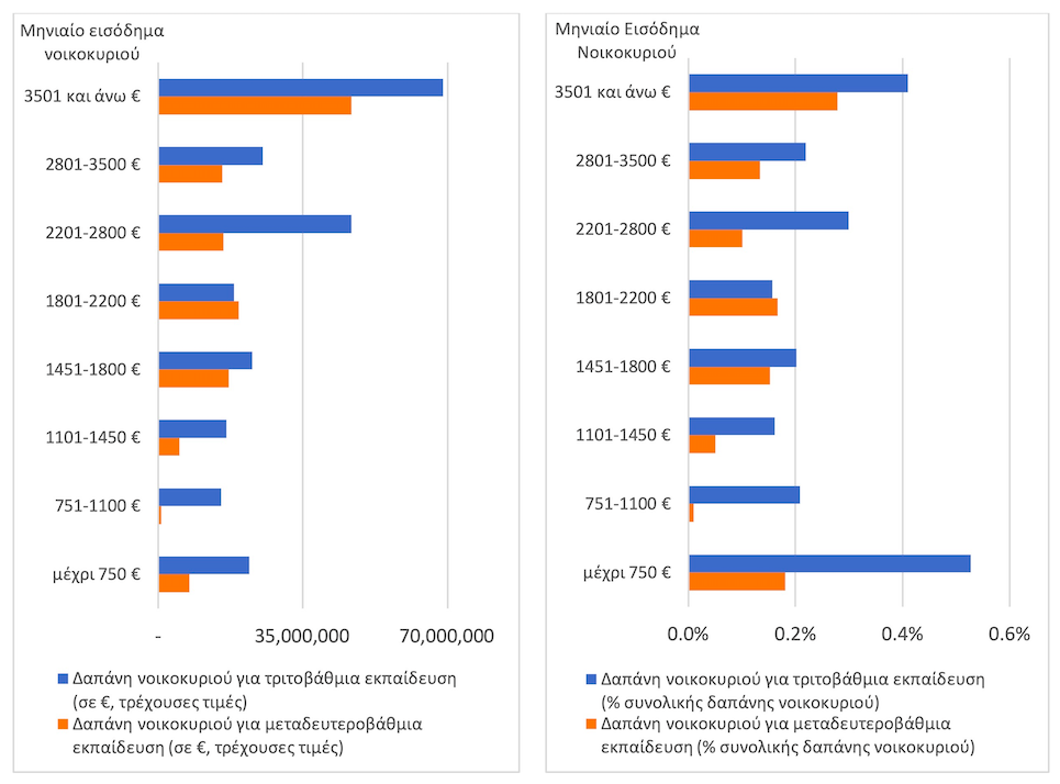 - Το 2021 η δαπάνη των νοικοκυριών για μεταλυκειακή (ΙΕΚ, Κολλέγια) και πανεπιστημιακή εκπαίδευση (δίδακτρα για προπτυχιακές, μεταπτυχιακές και διδακτορικές σπουδές στο δημόσιο και ιδιωτικό τομέα σε Ελλάδα και εξωτερικό) σε απόλυτες τιμές (σε ευρώ, τρέχουσες τιμές) αυξανόταν ανάλογα με το εισόδημα του νοικοκυριού, όσο υψηλότερο δηλαδή το εισόδημα τόσο υψηλότερη και η δαπάνη του νοικοκυριού. Παρ’ όλα αυτά, η αναλογική επιβάρυνση των νοικοκυριών, το ποσοστό δηλαδή του εισοδήματός τους που θυσιάζουν για μεταλυκειακή και τριτοβάθμια εκπαίδευση, είναι αντιστρόφως ανάλογο του εισοδήματός τους, με τα χαμηλής εισοδηματικής τάξης νοικοκυριά να θυσιάζουν πολλαπλάσιο ποσοστό του εισοδήματός τους για μεταλυκειακή και τριτοβάθμια εκπαίδευση σε σχέση με τα υψηλότερης εισοδηματικής τάξης νοικοκυριά.