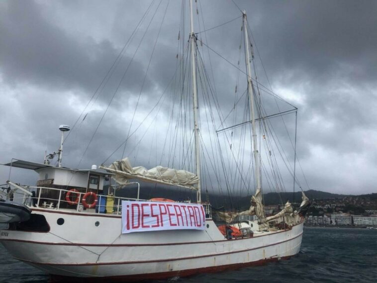 Αλληλέγγυοι-ες απ’ όλη την Ευρώπη, που μέρες τώρα προετοιμάζουν την υποδοχή των ζαπατίστας, φώναξαν συνθήματα περιμένοντας το καράβι να δέσει στο λιμάνι.