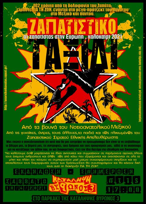 Με αφορμή την επέτειο δολοφονίας Ζαπάτα (102 χρόνια πριν), στήνουμε ένα κολάζ συλλογικής πληροφόρησης και μαζί ανακαλύπτουμε την ζωή του Ζαπάτα, την σχέση του με τους αγώνες για την υπεράσπιση της γης «Γη και Ελευθερία!», την σύνδεσή του με τους αγώνες του σήμερα και το ταξίδι των Ζαπατίστας στην Ευρώπη το καλοκαίρι που μας έρχεται!