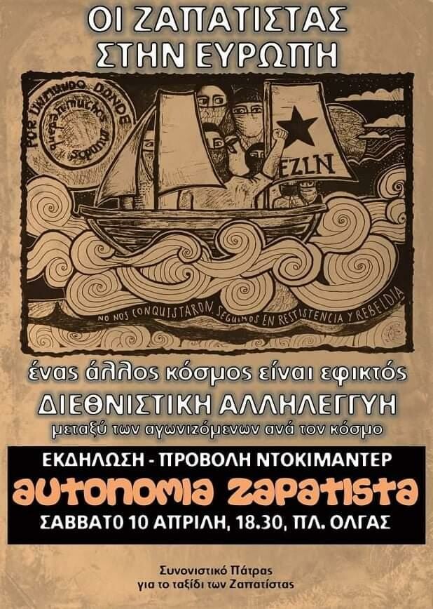 – Εκδήλωση και προβολή ντοκιμαντέρ: «Autonomía Zapatista», με αφορμή το ταξίδι των zapatistas στην Ευρώπη.