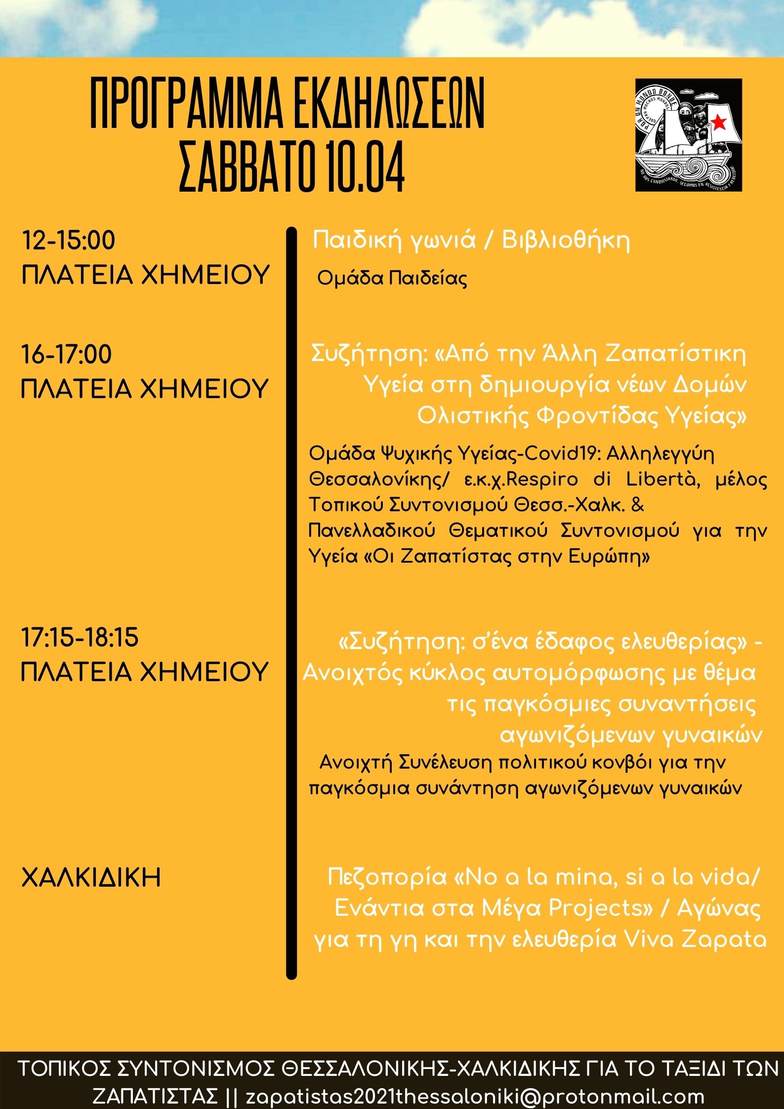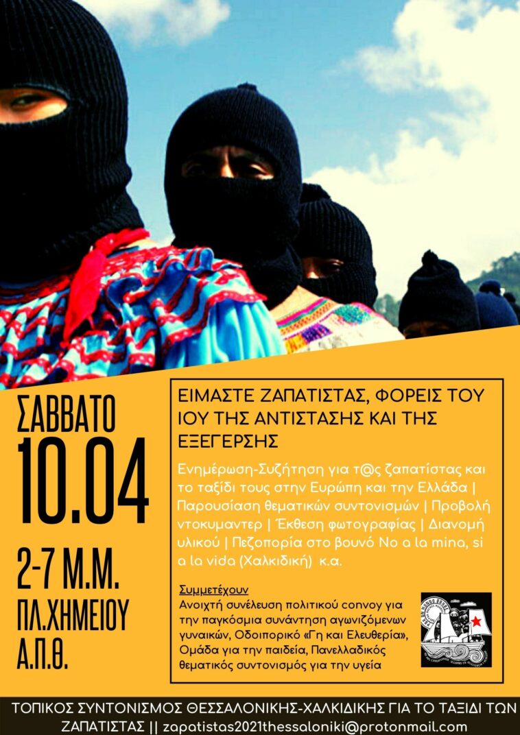 Στη Θεσσαλονίκη οι εκδηλώσεις που διοργανώνει ο «Τοπικός Συντονισμός Θεσσαλονίκης – Χαλκιδικής για το ταξίδι των Ζαπατίστας» θα γίνουν στην πλατεία Χημείου του επανοικειοποιημένου ΑΠΘ από τις 2 – 7μ.μ. ενώ αντίστοιχες δράσεις θα γίνουν σε Αθήνα, Καβάλα, Πάτρα, Λάρισα και Καλαμάτα.