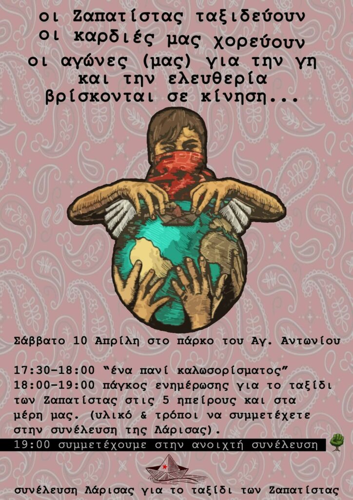 Οι από τα κάτω, ατομικότητες και συλλογικότητες, αυτοοργανωθήκαμε και συνεχίζουμε να το κάνουμε, σε ευρωπαϊκό, εθνικό, περιφερειακό και τοπικό επίπεδο, προκειμένου να υποδεχθούμε τους Ζαπατίστας (και) στην πόλη της Λάρισας. Η συμβολή κάθε αυτοοργανωμένης συλλογικότητας της πόλης, δείχνει με τον πιο έμπρακτο τρόπο ότι προσπαθούμε να δείξουμε την αλληλεγγύη, τον σεβασμό και τον θαυμασμό μας στις εξεγερμένες και αυτοοργανωμένες κοινότητες της Τσιάπας, θέλοντας ταυτόχρονα να μπολιάσουμε και τους δικούς μας αγώνες.