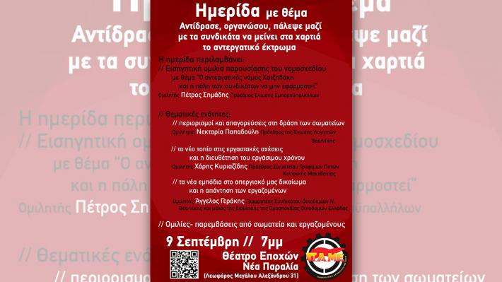 Ημερίδα με τίτλο «Αντίδρασε, οργανώσου, πάλεψε μαζί με τα Συνδικάτα να μείνει στα χαρτιά το αντεργατικό έκτρωμα» διοργανώνει το ΠΑΜΕ την Πέμπτη 9 Σεπτέμβρη στη Θεσσαλονίκη. Η ημερίδα θα πραγματοποιηθεί στις 19.00 στο θέατρο του Πάρκου των Εποχών στη Νέα Παραλία Θεσσαλονίκης.