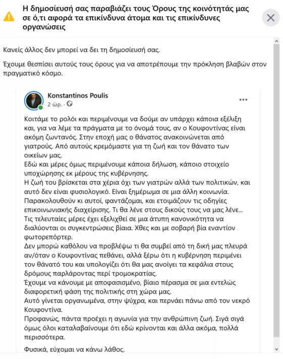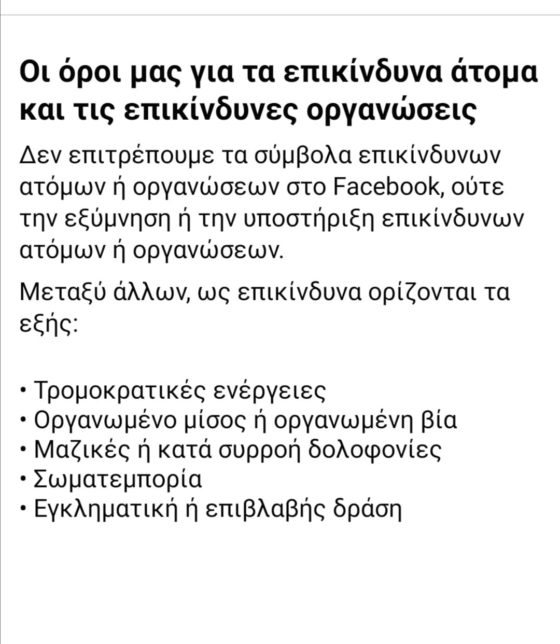 Μία ακόμη στιγμή εθνικής υπερηφάνειας μας χαρίζει η κυβέρνηση της ΝΔ, καθώς μετά τις τελευταίες θέσεις στους δείκτες της ανεργίας, της ύφεσης, των δαπανών για την υγεία, των ελεγχόμενων ΜΜΕ, στο Wikipedia στο λήμμα Censorship of Facebook, υπάρχει πλέον ειδική αναφορά και στη χώρα μας που σημειώνει πως τον Φεβρουάριο του 2021 δημοσιογράφοι και άλλοι πολίτες είδαν αναρτήσεις και εκδηλώσεις τους να διαγράφονται επειδή δημοσίευσαν άρθρα που στάθηκαν με αλληλεγγύη στο αίτημα του απεργού πείνας Δ. Κουφοντίνα.