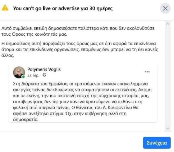 Αυτό που συμβαίνει τις τελευταίες μέρες στο Facebook είναι πρωτόγνωρο για την Ελλάδα. Δεκάδες δημοσιογράφοι, δικηγόροι, πολίτες αλλά και συνδικαλιστικοί φορείς, πρωτοβουλίες αλληλεγγύης και πολιτικές συλλογικότητες ενημερώθηκαν από το Facebook πως οι αναρτήσεις τους, που αφορούσαν την απεργία πείνας του Δ. Κουφοντίνα, δεν τηρούσαν τους κανόνες δημοσίευσης.