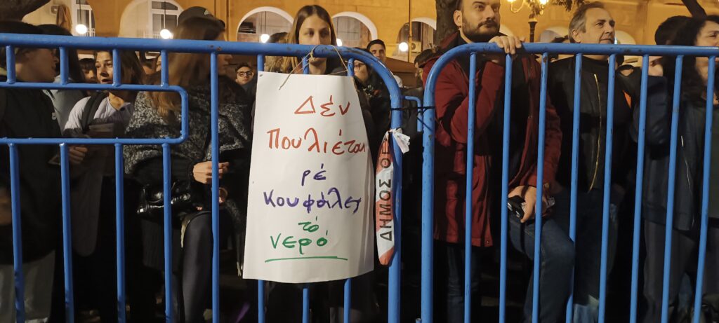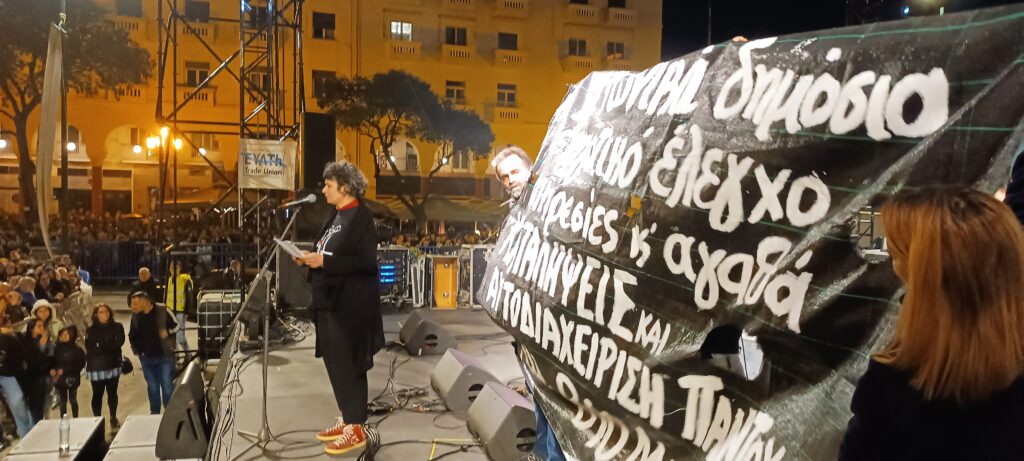 «Ο κ. Μητσοτάκης είπε από τις Βρυξέλλες ότι η ιδιωτικοποίηση είναι fake news. Ας έρθει εδώ να πει ότι είναι fake news. Tέσσερις αποφάσεις του ΣτΕ, το 2014 με 220.000 συμμετοχή στο ιστορικό δημοψήφισμα η Θεσσαλονίκη είπε ΟΧΙ στην ιδιωτικοποίηση. 21 Μαΐου έχουμε εκλογές. Καλούμε όλα τα κόμματα να δεσμευτούν τι θα κάνουν με τη Ρυθμιστική Αρχή Υδάτων. Ρυθμιστική Αρχή Υδάτων σημαίνει ιδιωτικοποίηση του νερού. Δεν μπορούν να ελέγξουν τίποτα, πληρώνουμε το πιο ακριβό ρεύμα στην Ευρώπη» δήλωσε ο Γ. Αρχοντόπουλος, πρόεδρος του σωματείου στον χαιρετισμό του κλείνοντας την τοποθέτησή του με τα λόγια του Μανώλη Γλέζου «Αν εσύ ζήσεις μη με ξεχάσεις». Υπενθύμισε ακόμη ότι από τη μέρα αυτή «λείπουν ανάμεσα μας 57 κορίτσια και αγόρια που δολοφονήθηκαν στα Τέμπη, γιατί για κάποιους τα κέρδη και οι ιδιωτικοποιήσεις είναι πάνω από τις ζωές μας. Σήμερα τραγουδάμε για τα 57 αδέλφια μας. Σας ευχαριστούμε πολύ».