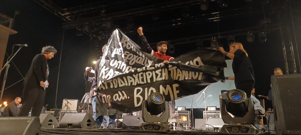 Τον λόγο έλαβαν κινήματα της πόλης, όπως η Πρωτοβουλία αλληλεγγύης στη ΒΙΟΜΕ, υπενθυμίζοντας ότι οι εργαζόμενοι-ες του μοναδικού αυτοδιαχειριζόμενου εργοστασίου στην Ελλάδα αντιστάθηκαν εδώ και δέκα χρόνια στον φόβο, πήραν τη ζωή τους στα χέρια τους και αποφάσισαν να καταλάβουν το εργοστάσιο για να απαλλαγούν από την καταπίεση αιώνων. «Με τη στήριξη ενός παγκόσμιου κινήματος αλληλεγγύης κράτησαν το εργοστάσιο χωρίς αφεντικά» είπε εκπρόσωπος της Πρωτοβουλίας αλληλεγγύης στη ΒΙΟΜΕ καλώντας τη Θεσσαλονίκη να σταθεί στο πλευρό των εργατών/τριών τώρα που το εργοστάσιο κινδυνεύει λόγω του πλειστηριασμού του οικοπέδου.