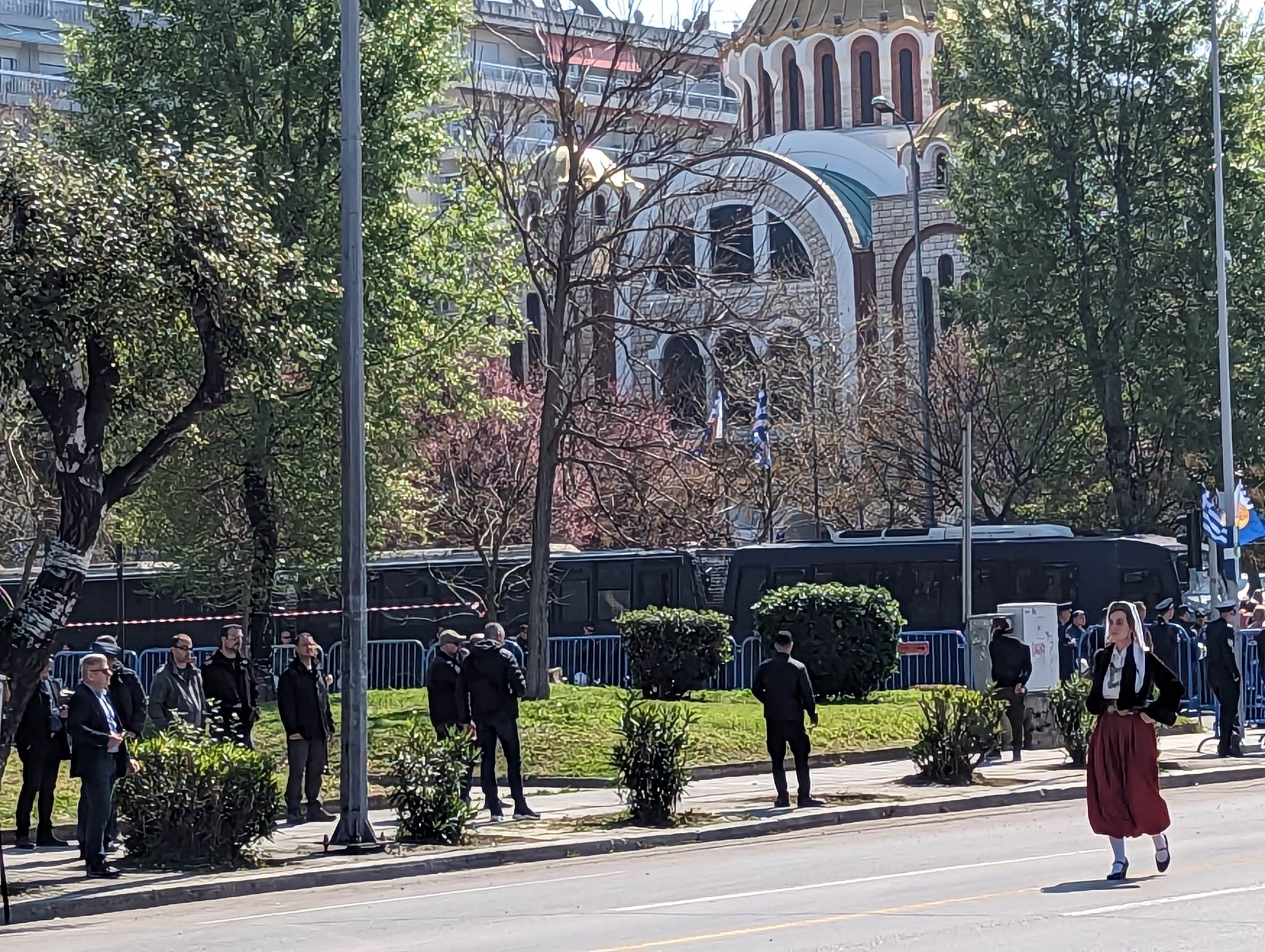 Τα αστυνομικά μέτρα ήταν ιδιαίτερα έντονα, κυρίως κοντά στις εξέδρες των επισήμων, κάτι που δεν συνηθίζεται σε άλλες μαθητικές παρελάσεις στη Θεσσαλονίκη. Η κοινωνική οργή που έχει δημιουργηθεί μετά το σιδηροδρομικό έγκλημα στα Τέμπη οδήγησε σε αυξημένα μέτρα, με παρουσία πολλών ΜΑΤ και ανδρών της ασφάλειας σε όλο το μήκος της μαθητικής παρέλασης.