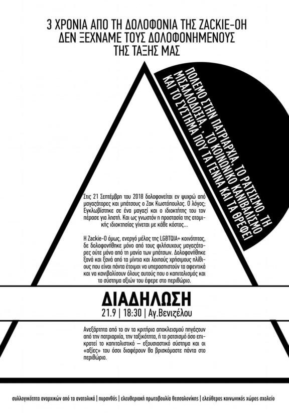 «Τρία χρόνια χωρίς τον Ζακ, χωρίς τη Zackie. Η θλίψη παραμένει απέραντη βαθιά μέσα μας, η οργή ακόμα μεγαλύτερη. Όλοι οι δολοφόνοι κυκλοφορούν ακόμα ελεύθεροι. Έχει οριστεί η δίκη για τον Οκτώβριο και ελπίζουμε να πραγματοποιηθεί και να μην αθωωθεί κανένας τους. Και να αναδειχτούν στο δικαστήριο οι πραγματικοί λόγοι της δολοφονίας».