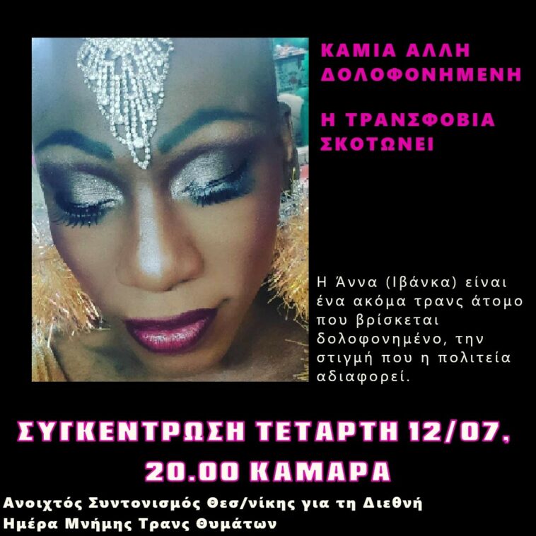 Πρωτοβουλίες και συλλογικότητες καλούν σήμερα σε πορεία διαμαρτυρίας στην Καμάρα στις 20:00 για τη δολοφονία της Άννας/Ιβάνκα, τρανς γυναίκας μετανάστριας από την Κούβα και performer, μέσα στο ίδιο της το σπίτι, χωρίς προς το παρόν να έχει εντοπιστεί κάποιος δράστης.