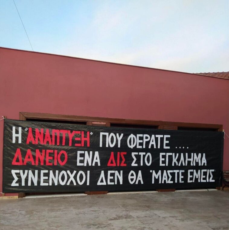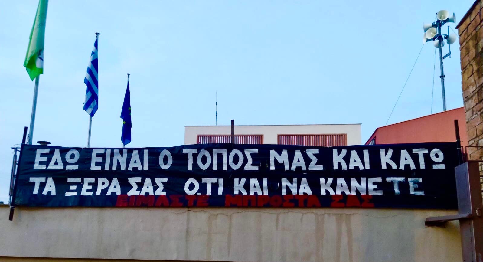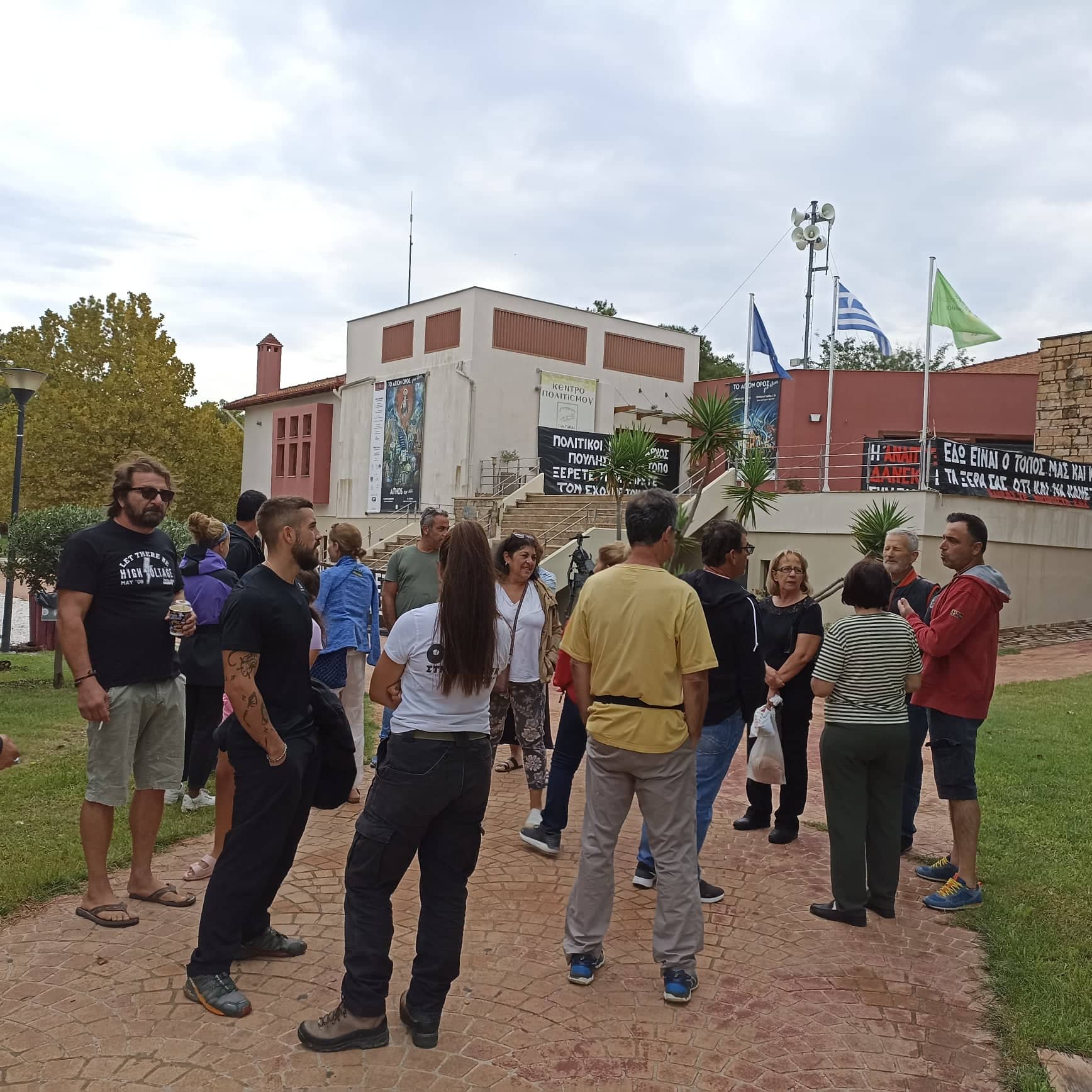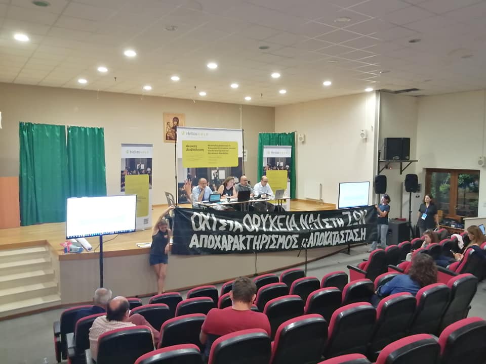 Οι εκπρόσωποι της Ελληνικός Χρυσός καθώς και μέλη της εταιρείας που έχει αναλάβει τη διεξαγωγή της «διαβούλευσης» βρήκαν το Πολιτιστικό Κέντρο κλειστό από πανό της επιτροπής κατοίκων με συνθήματα ενάντια στην εξόρυξη και το επενδυτικό της σχέδιο.