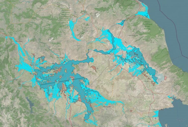 Με γαλάζιο φαίνεται η ζώνη πλημμύρας 100 ετών (δηλαδή με πιθανότητα 1% να συμβεί κάθε έτος) που είχε μοντελοποιηθεί στα Σχέδια Διαχείρισης Κινδύνων Πλημμύρας για τη Θεσσαλία. Οι χάρτες αυτοί είναι δημοσιευμένοι από το 2018 εδώ: https://floods.ypeka.gr/