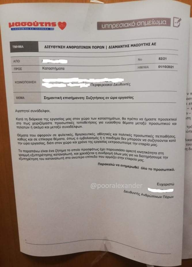«Η πρόσφατη προσπάθεια της εργοδοσίας του Μασούτη να απαγορεύσει στους εργαζόμενους τη συζήτηση σχετικά με επίκαιρα ζητήματα της καθημερινότητας μας, όπως οι πολιτικές εξελίξεις, η πανδημία και ο εμβολιασμός, με λίγα λόγια τα προβλήματα και οι δυσκολίες που αντιμετωπίζει ο λαός μας στο σύνολο του, δείχνει ξεκάθαρα, για άλλη μια φορά πως θέλουν να επιβάλλουν κλίμα τρομοκρατίας και απομόνωσης των εργαζομένων. Το κεφάλι κάτω και το στόμα κλειστό, ώστε να συνεχίζεται ανενόχλητα η κερδοφορία της εργοδοσίας.