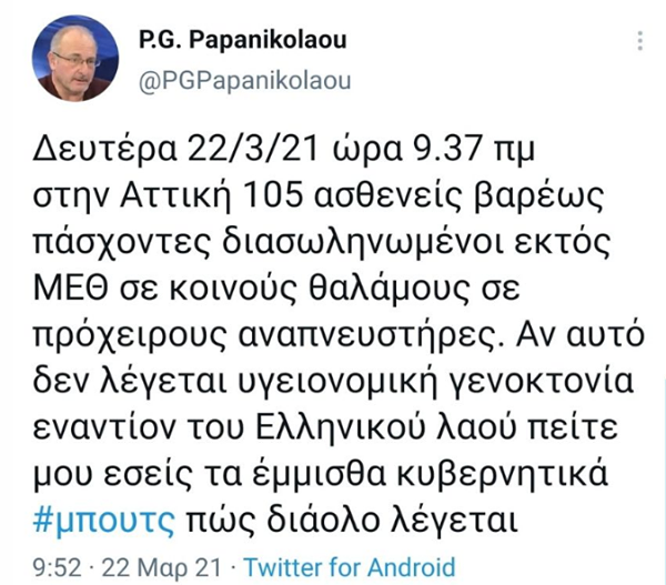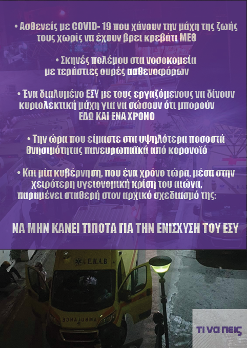 Ο γενικός γραμματέας της ΟΕΝΓΕ ενημέρωσε πως σήμερα στις 9.37 το πρωί 105 ασθενείς ήταν αυτοί οι οποίοι παρέμεναν διασωληνωμένοι εκτός ΜΕΘ, ενώ αντίστοιχα περιστατικά είχαμε συναντήσει και στη Θεσσαλονίκη πριν λίγους μήνες, με τον Αθ. Σιούλη, Πρόεδρο του σωματείου εργαζομένων του ΑΧΕΠΑ να καλείται να απολογηθεί για τα αδικήματα της διασποράς ψευδών ειδήσεων και της απειλής διάπραξης εγκλημάτων (!) μέσα από δηλώσεις του στα ΜΜΕ», επειδή είχε τολμήσει να αναφέρει το κοινό μυστικό που κανείς δεν είχε το δικαίωμα να αποκαλύψει στην κοινωνία: Πως το Σύστημα Υγείας, παρά τις υπεράνθρωπες προσπάθειες του προσωπικού, είναι ανοχύρωτο και ανεπαρκές, πως οι ΜΕΘ ήταν και είναι γεμάτες σε τέτοιο βαθμό που τα τακτικά χειρουργεία έχουν μειωθεί κατά 80% και ασθενείς συρρέουν μαζικά στις ιδιωτικές κλινικές που θησαυρίζουν, πως υπήρχε και υπάρχει διαλογή ασθενών από τη στιγμή που οι διαθέσιμες κλίνες ή είναι ελάχιστες ή δεν υπάρχουν καν.