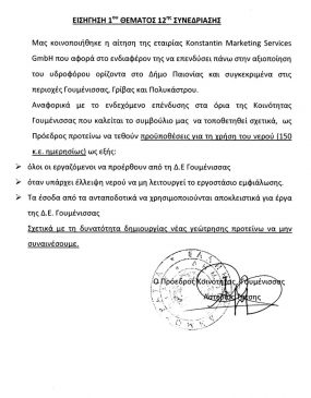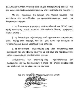 «Το νερό είναι ένα κοινωνικό αγαθό και όχι κάποιο επενδυτικό προϊόν. Το ενδιαφέρον της εταιρίας Konstantin Marketing Services GmbH να πραγματοποιήσει επένδυση στην περιοχή μας, αξιοποιώντας τον υδροφόρο ορίζοντα και τα ύδατά για τη δημιουργία μονάδας επεξεργασίας-εμφιάλωσης νερού, δεν πρέπει να μας χαροποιεί, αλλά να μας προβληματίζει έντονα.